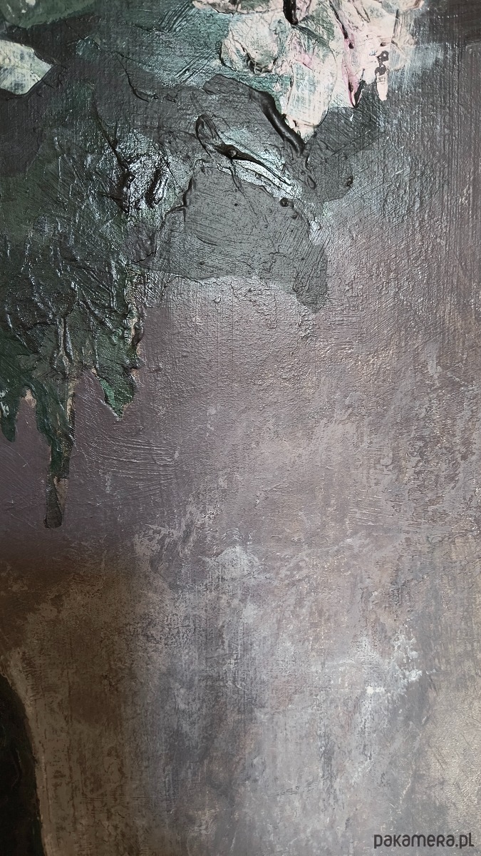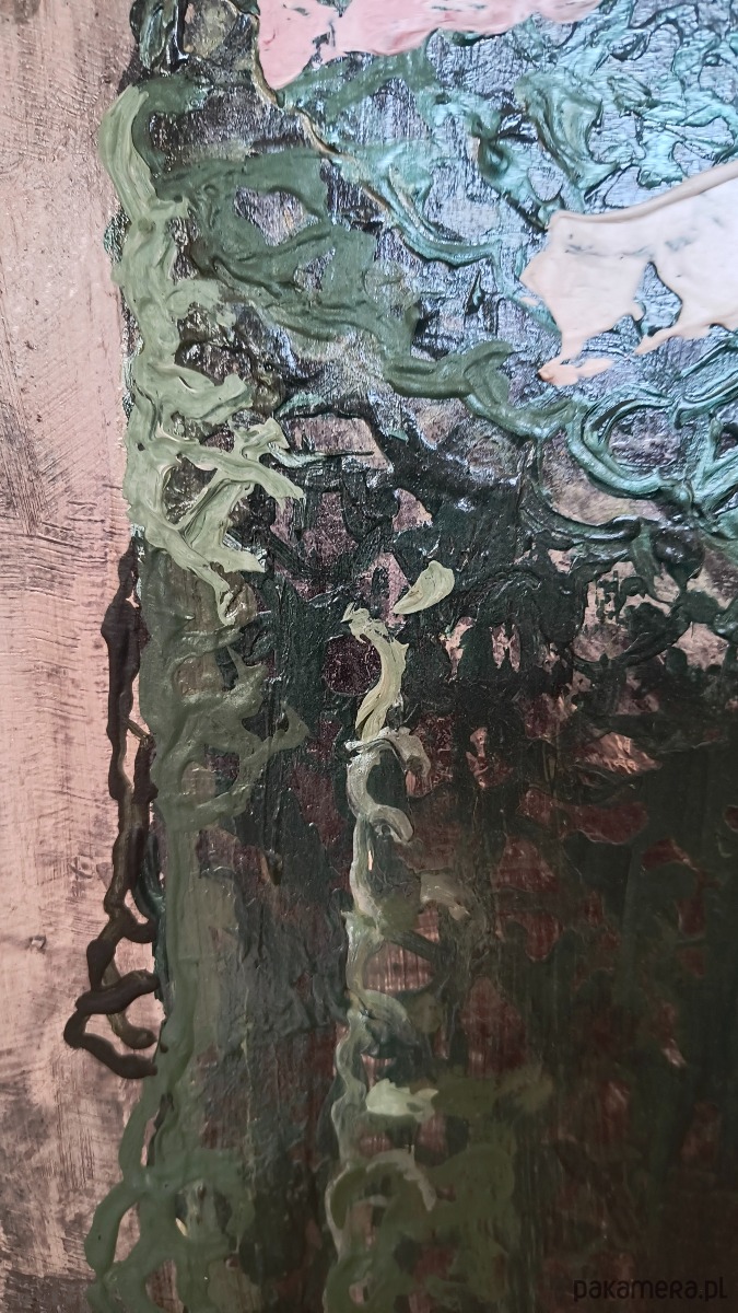 🎨 Obraz namalowany został na grubej płycie pilśniowej farbami akrylowymi. Widoczna faktura farby gruba kładzionej, laserunek, gdzieniegdzie prześwity srebra. Format: 100x70 cm