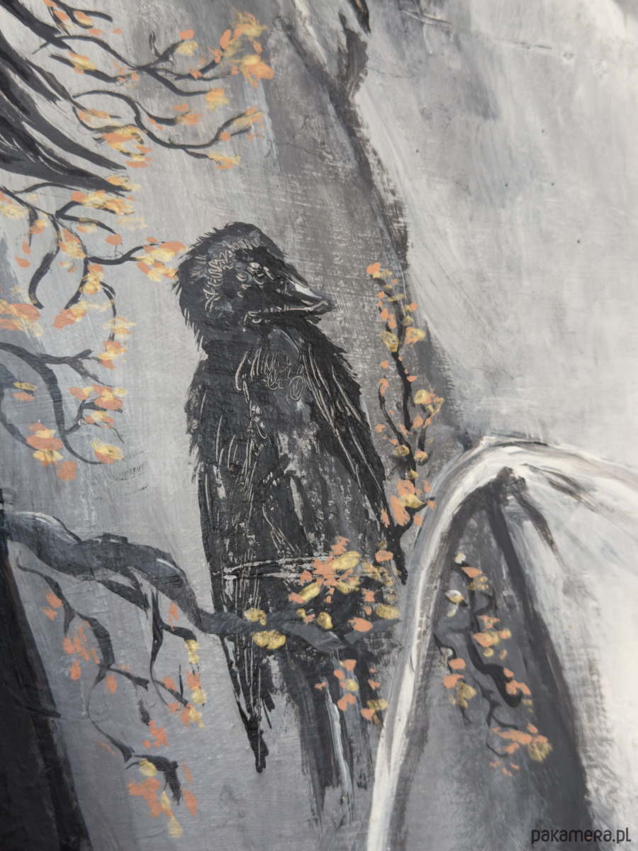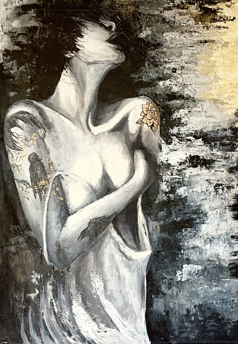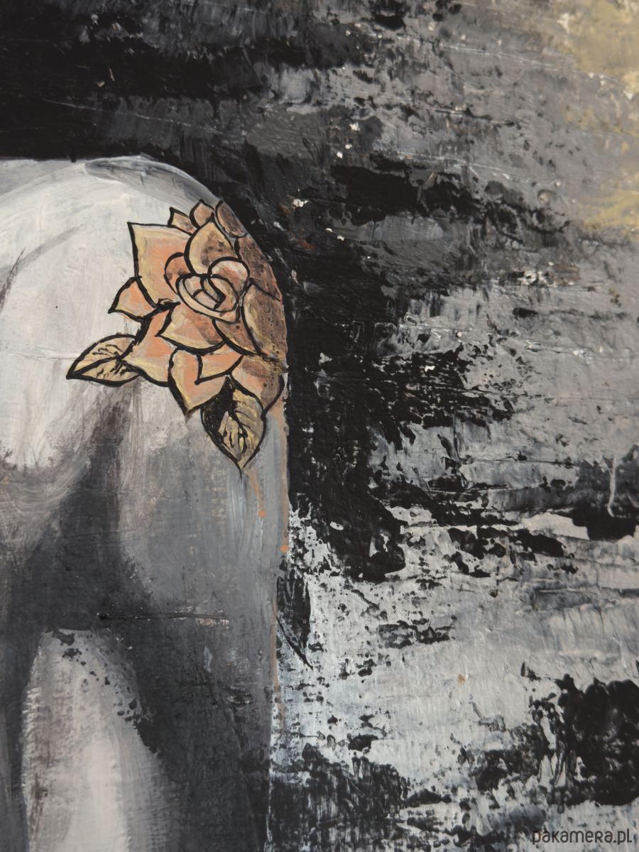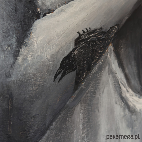 Autorski obraz wykonany akrylem w ciemnej tonacji przechodzącej płynnie od bieli, szarości, srebra po czerń.