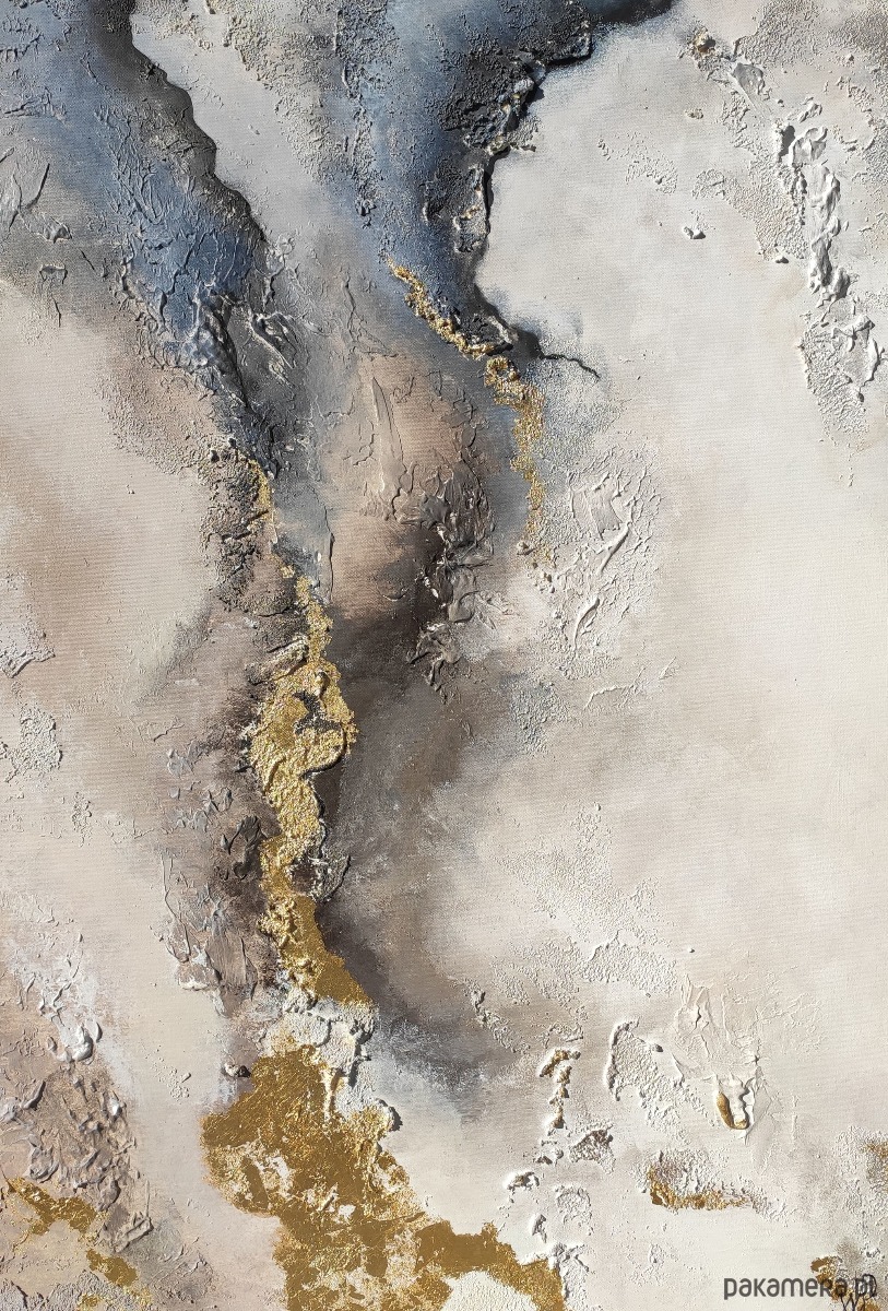 Kolorystyka: biel, beże, szarości, delikatna szarość, granat/ błękit , fragmenty obrazu posiadają grubszą strukturę, złocenia szlagmetalem. Spokojne, stonowane kolory.