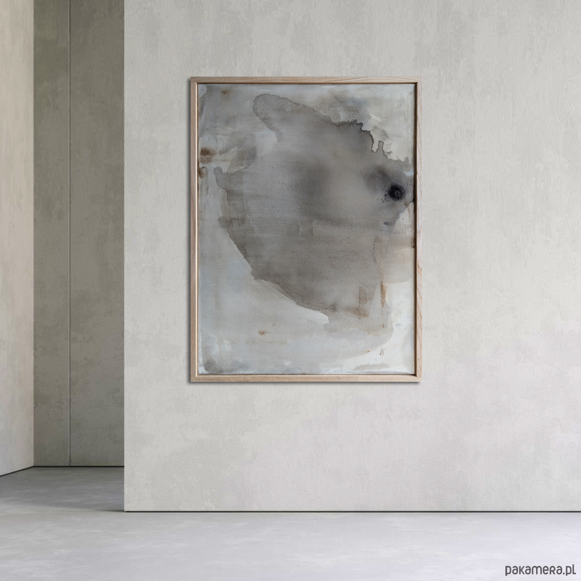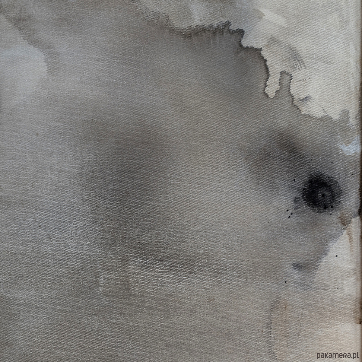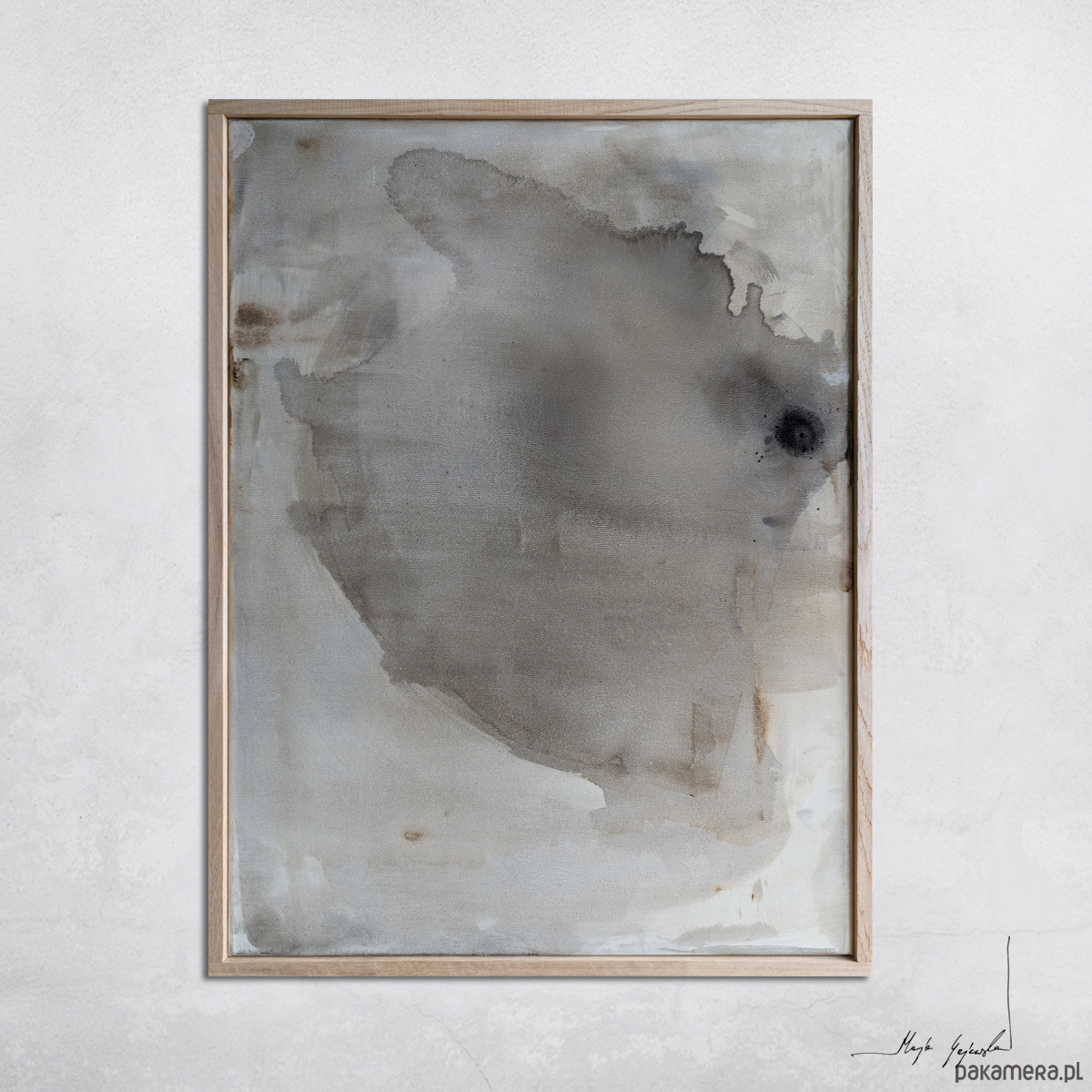 Kompozycja abstrakcyjna utrzymana w ograniczonej gamie szarości, beżu i czerni. W centralnej płaszczyźnie obrazu rozpościera się nieregularna, organiczna forma o płynnych konturach i zróżnicowanym nasyceniu barwy. W górnej prawej części kompozycji pojawia się ciemniejsza plama – akcent o większej intensywności, wprowadzający napięcie i punkt skupienia wzroku.