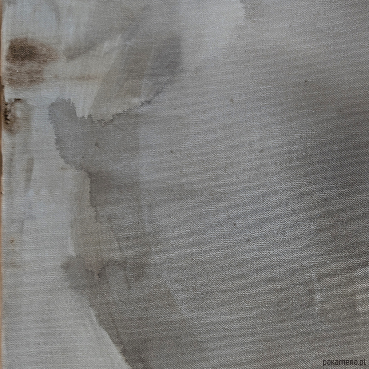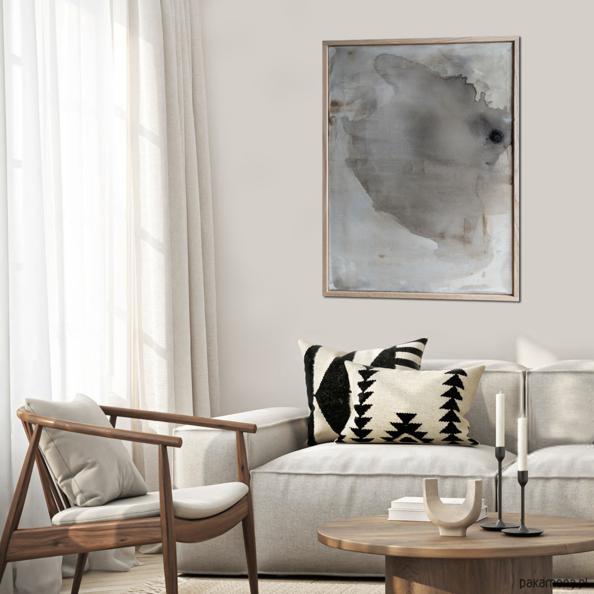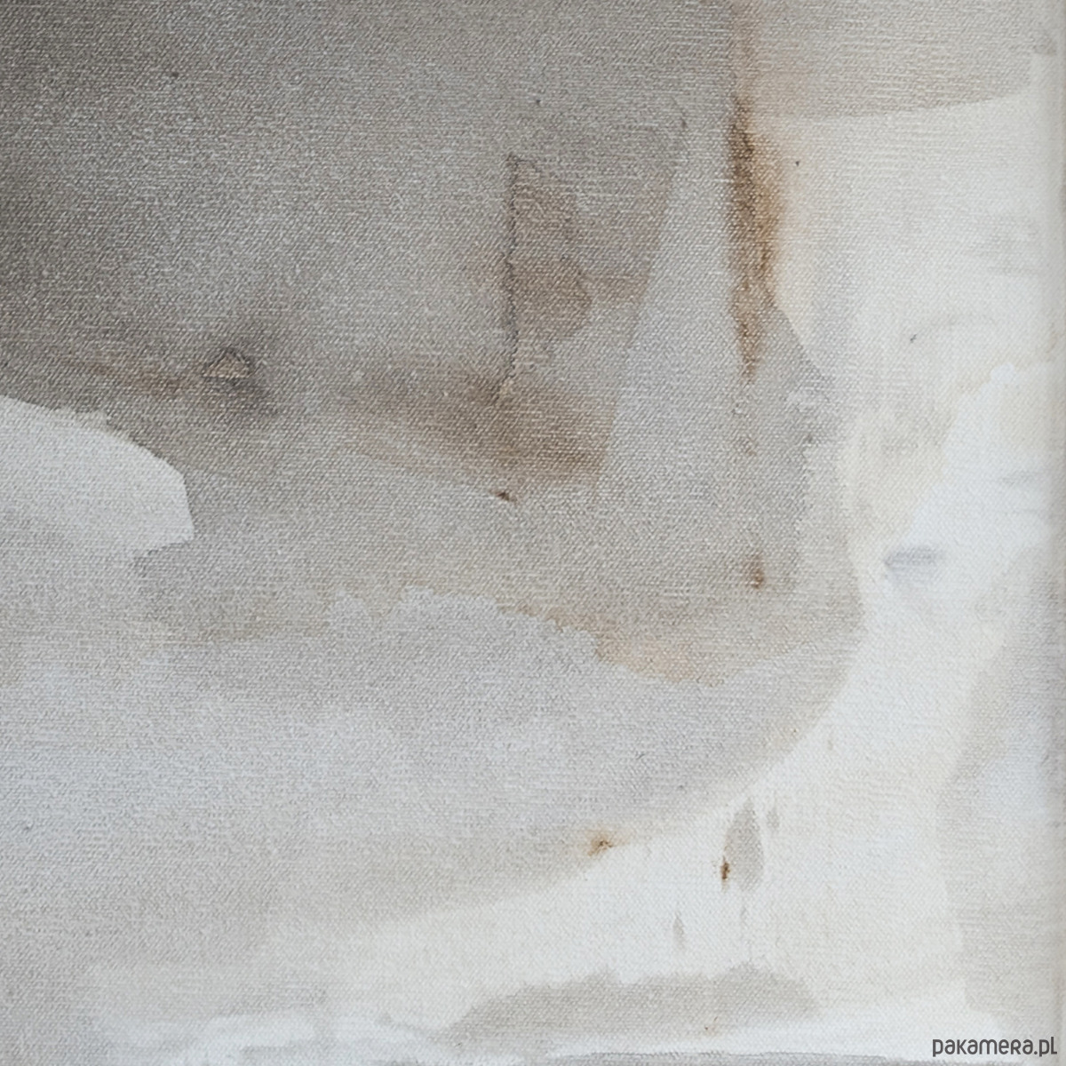 Kompozycja abstrakcyjna utrzymana w ograniczonej gamie szarości, beżu i czerni. W centralnej płaszczyźnie obrazu rozpościera się nieregularna, organiczna forma o płynnych konturach i zróżnicowanym nasyceniu barwy. W górnej prawej części kompozycji pojawia się ciemniejsza plama – akcent o większej intensywności, wprowadzający napięcie i punkt skupienia wzroku.