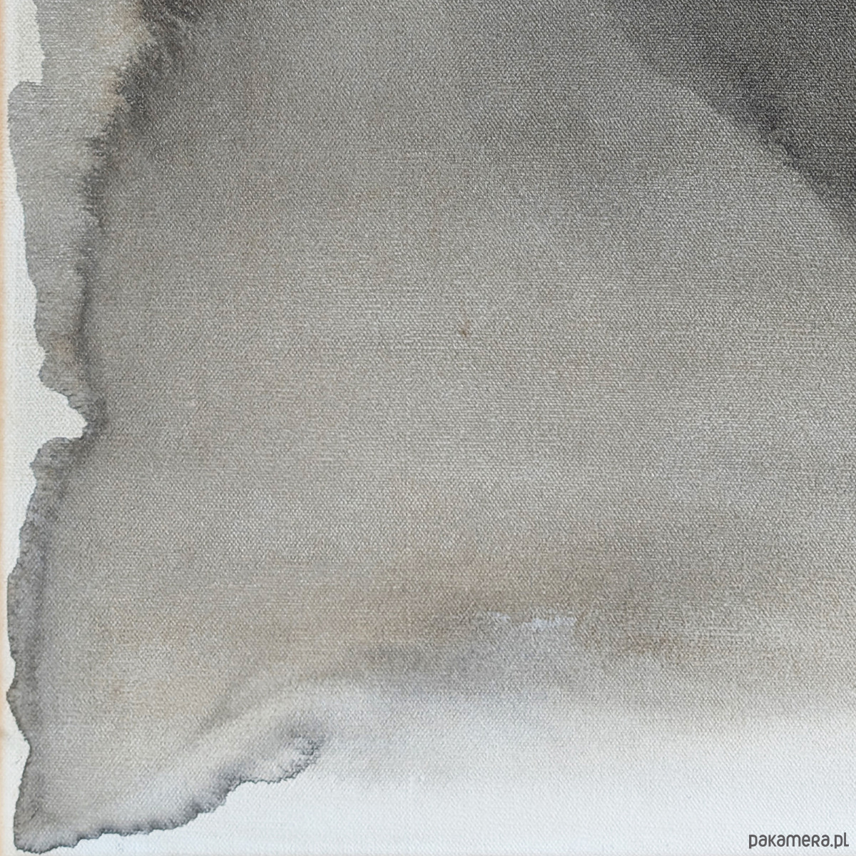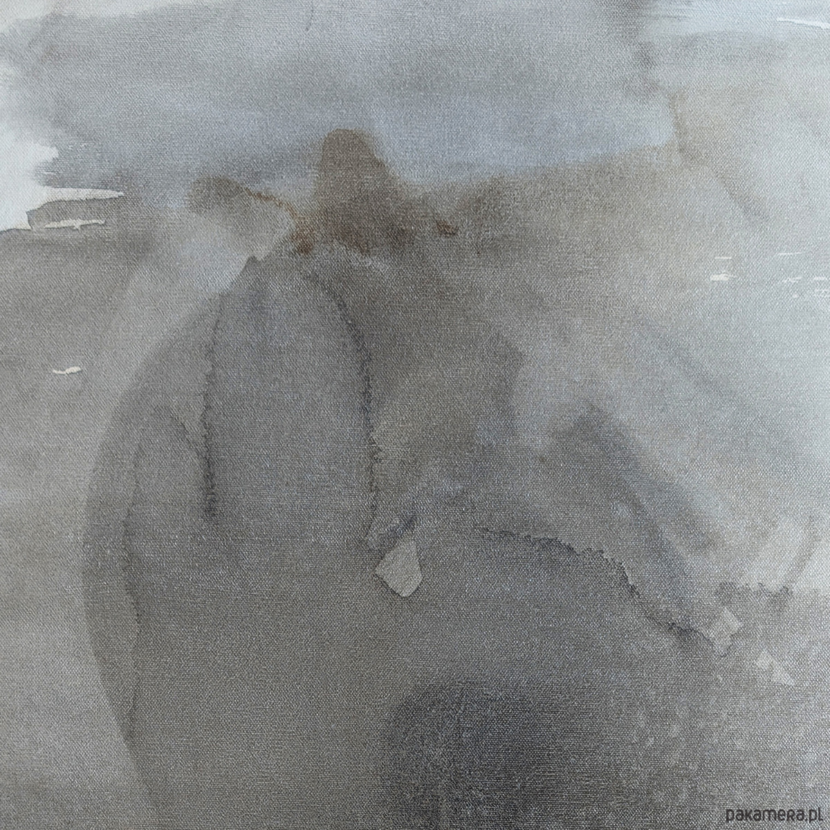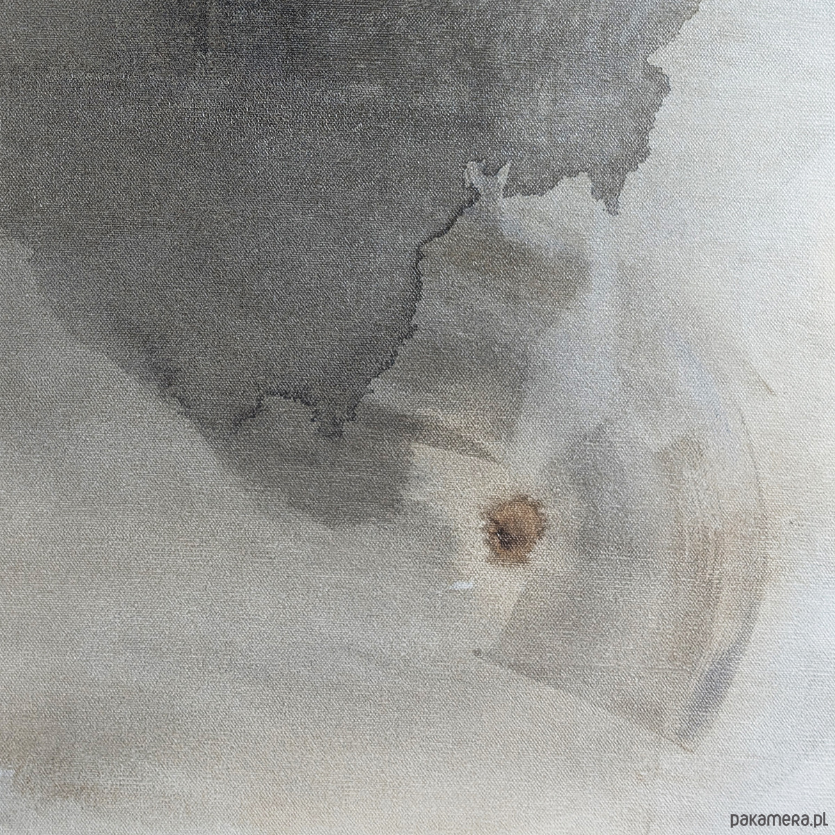 Kompozycja abstrakcyjna utrzymana w ograniczonej gamie szarości, beżu i czerni. W centralnej płaszczyźnie obrazu rozpościera się nieregularna, organiczna forma o płynnych konturach i zróżnicowanym nasyceniu barwy. W górnej prawej części kompozycji pojawia się ciemniejsza plama – akcent o większej intensywności, wprowadzający napięcie i punkt skupienia wzroku.