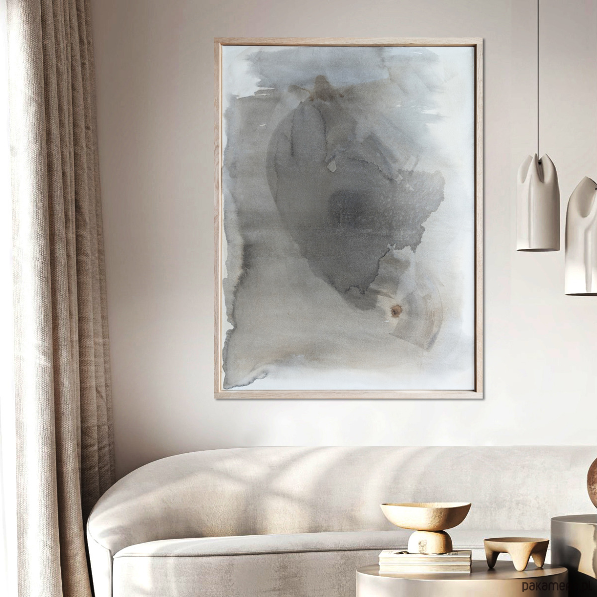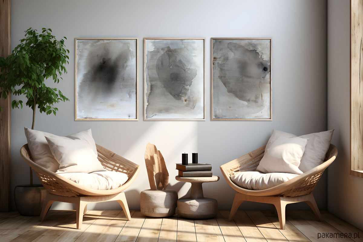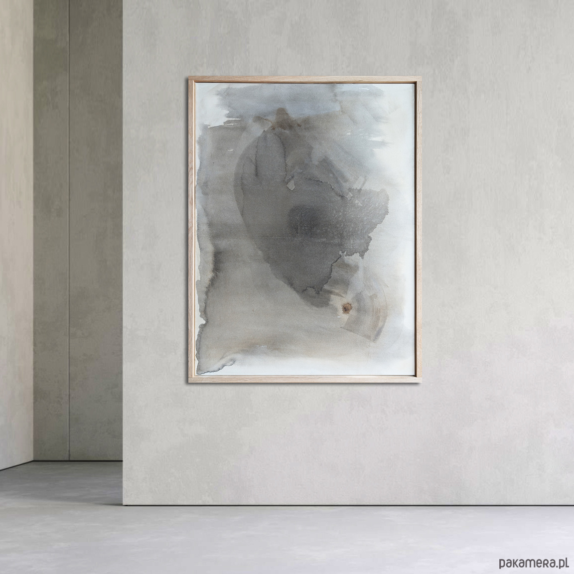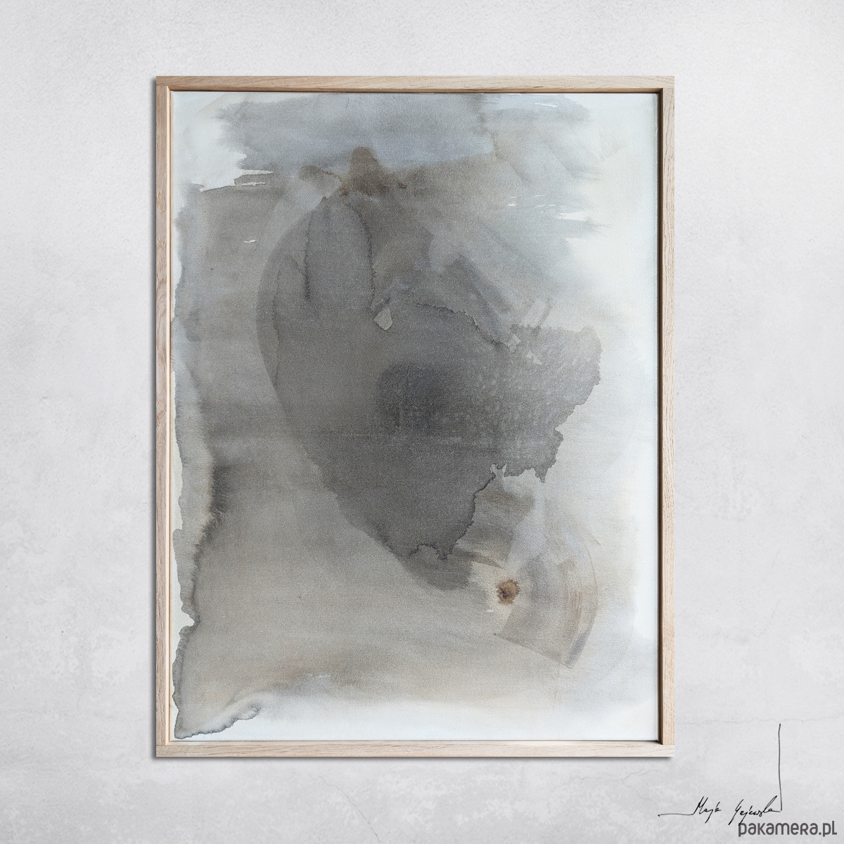 Kompozycja abstrakcyjna utrzymana w ograniczonej gamie szarości, beżu i czerni. W centralnej płaszczyźnie obrazu rozpościera się nieregularna, organiczna forma o płynnych konturach i zróżnicowanym nasyceniu barwy. W górnej prawej części kompozycji pojawia się ciemniejsza plama – akcent o większej intensywności, wprowadzający napięcie i punkt skupienia wzroku.
