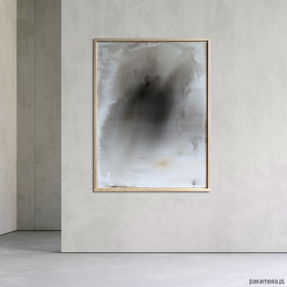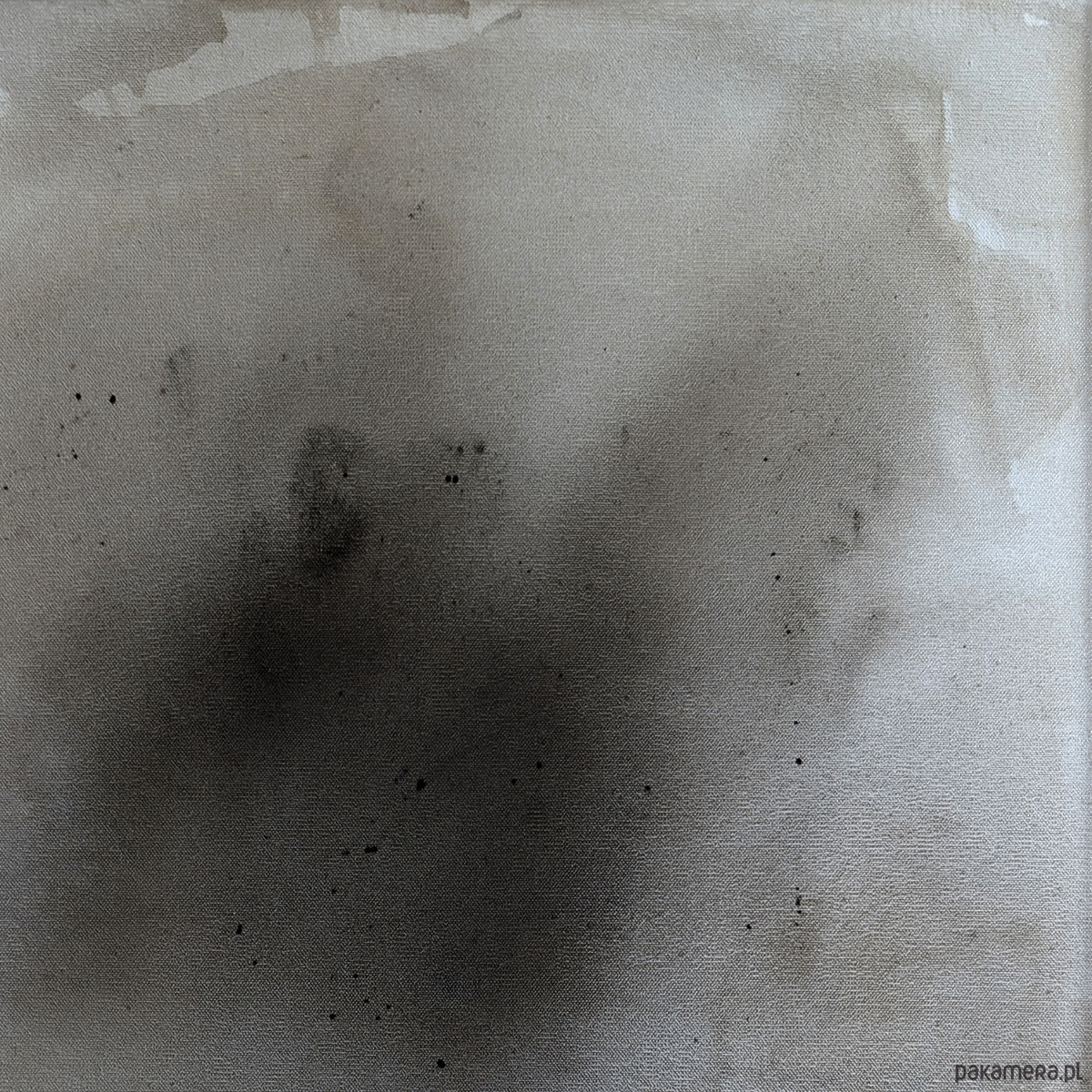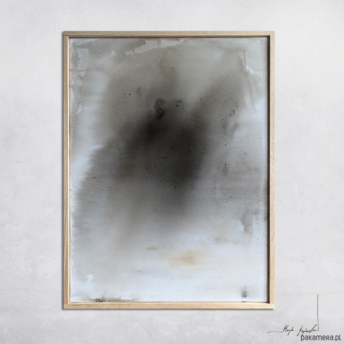 Kompozycja abstrakcyjna utrzymana w ograniczonej gamie szarości, beżu i czerni. W centralnej płaszczyźnie obrazu rozpościera się nieregularna, organiczna forma o płynnych konturach i zróżnicowanym nasyceniu barwy. W górnej prawej części kompozycji pojawia się ciemniejsza plama – akcent o większej intensywności, wprowadzający napięcie i punkt skupienia wzroku.