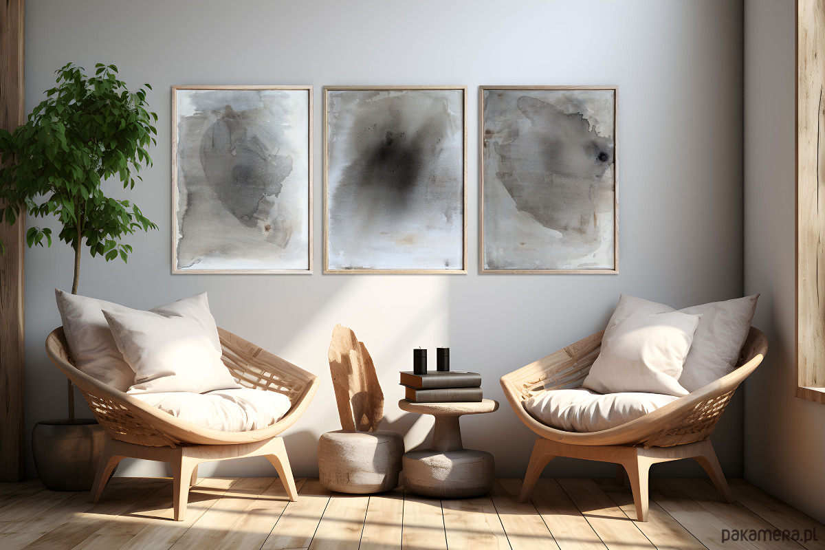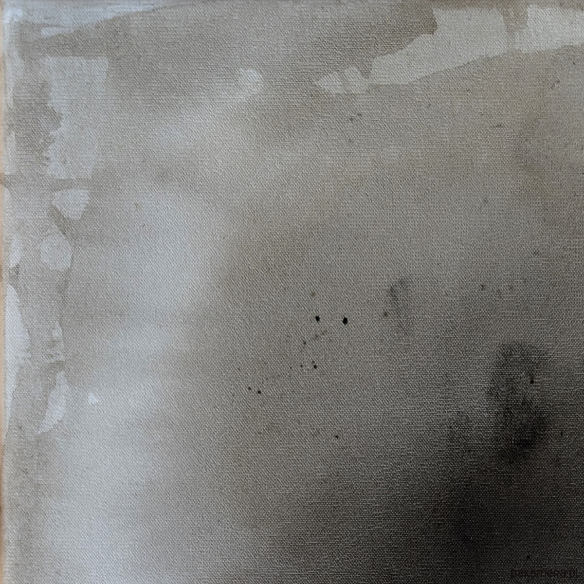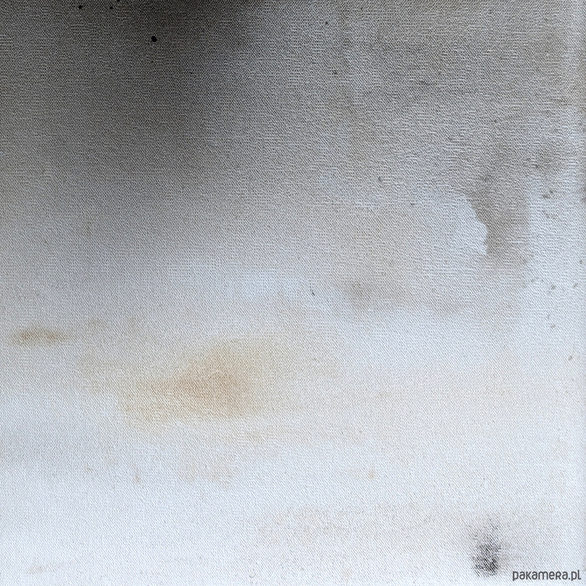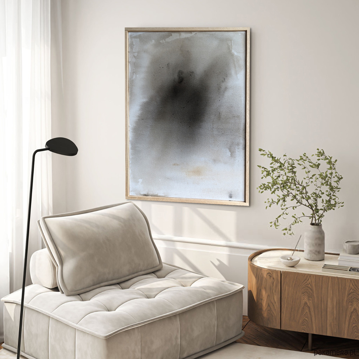 Kompozycja abstrakcyjna utrzymana w ograniczonej gamie szarości, beżu i czerni. W centralnej płaszczyźnie obrazu rozpościera się nieregularna, organiczna forma o płynnych konturach i zróżnicowanym nasyceniu barwy. W górnej prawej części kompozycji pojawia się ciemniejsza plama – akcent o większej intensywności, wprowadzający napięcie i punkt skupienia wzroku.