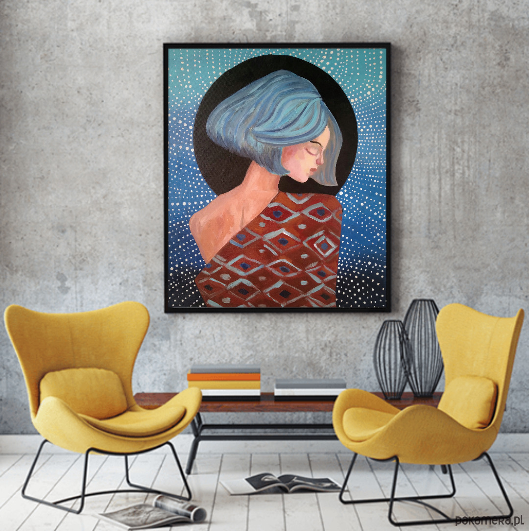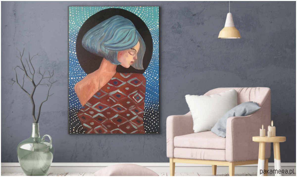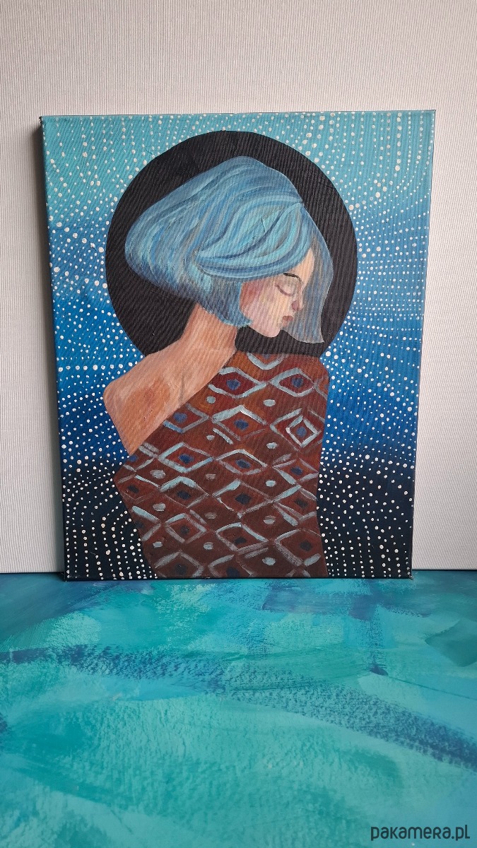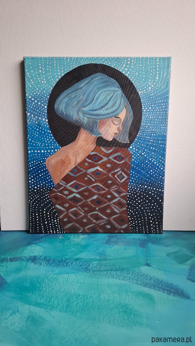 Seria „Wibracje” to cykl portretów kobiecych, w których zmysłowość i zaduma spotykają się z rytmem koloru i formy. Każda z postaci pulsuje własną energią — uchwyconą w liniach, fakturze i świetlistych punktach tła.