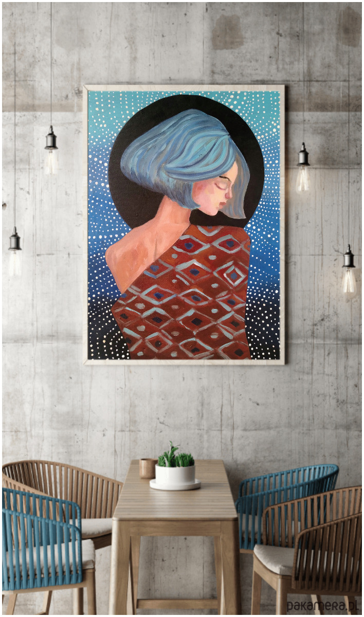 Kobiety z obrazów emanują spokojem, melancholią lub wewnętrzną siłą. Ich włosy i otoczenie przenikają się z abstrakcyjnym, niemal muzycznym rytmem kropek i ornamentów, które symbolizują energię, emocje i niewidzialne drgania obecne między światem zewnętrznym a tym, co pod skórą.