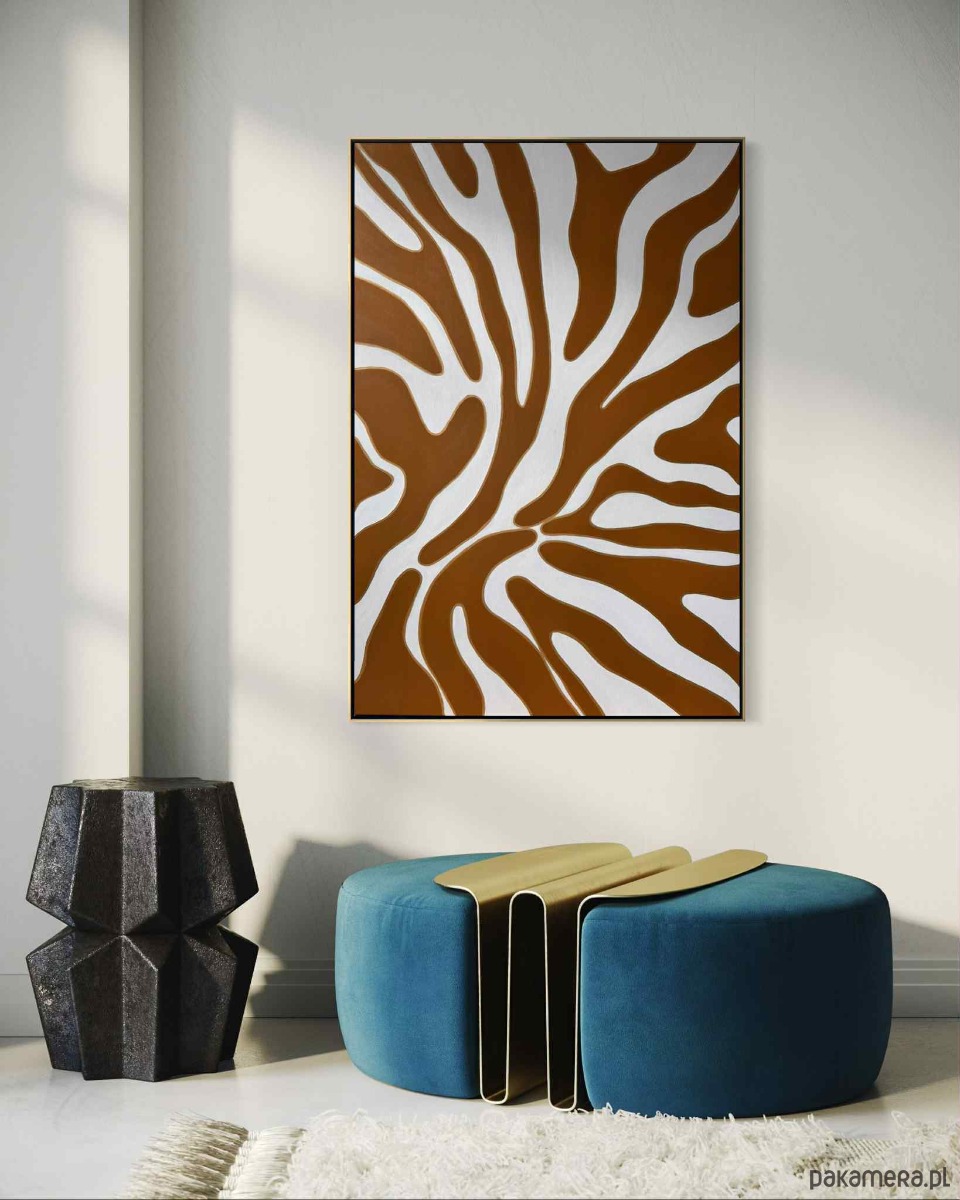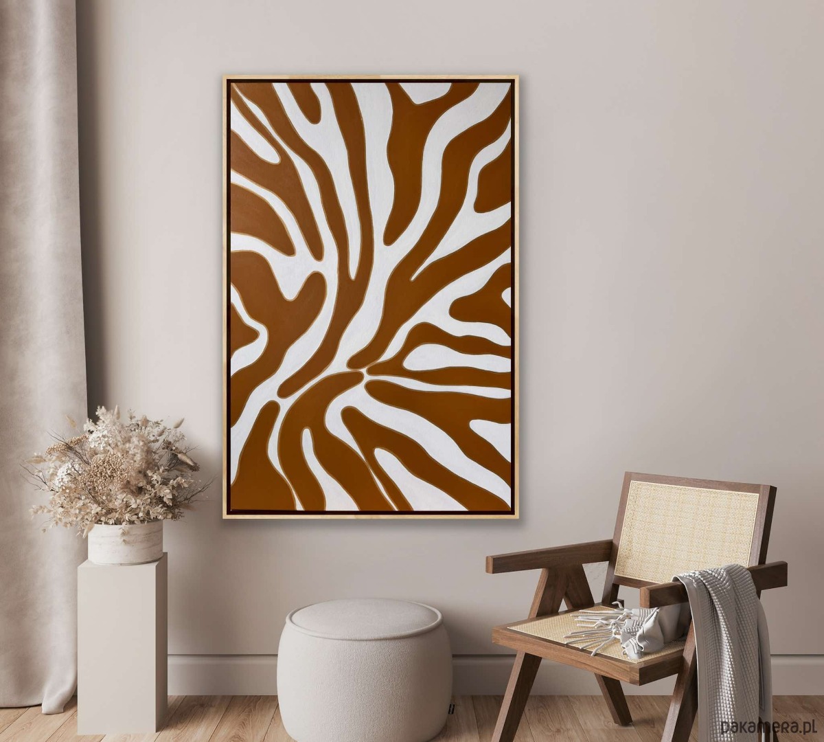 Abstrakcyjny obraz prezentujący motyw zwierzęcego umaszczenia. Wyrazista, kompozycja brązu i bieli, którą można powiesić w 4 różnych pozycjach.