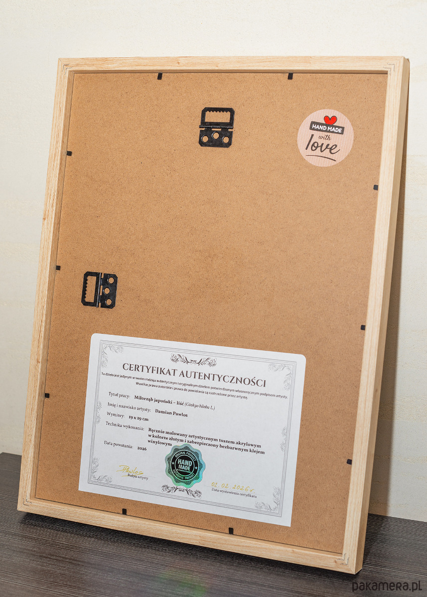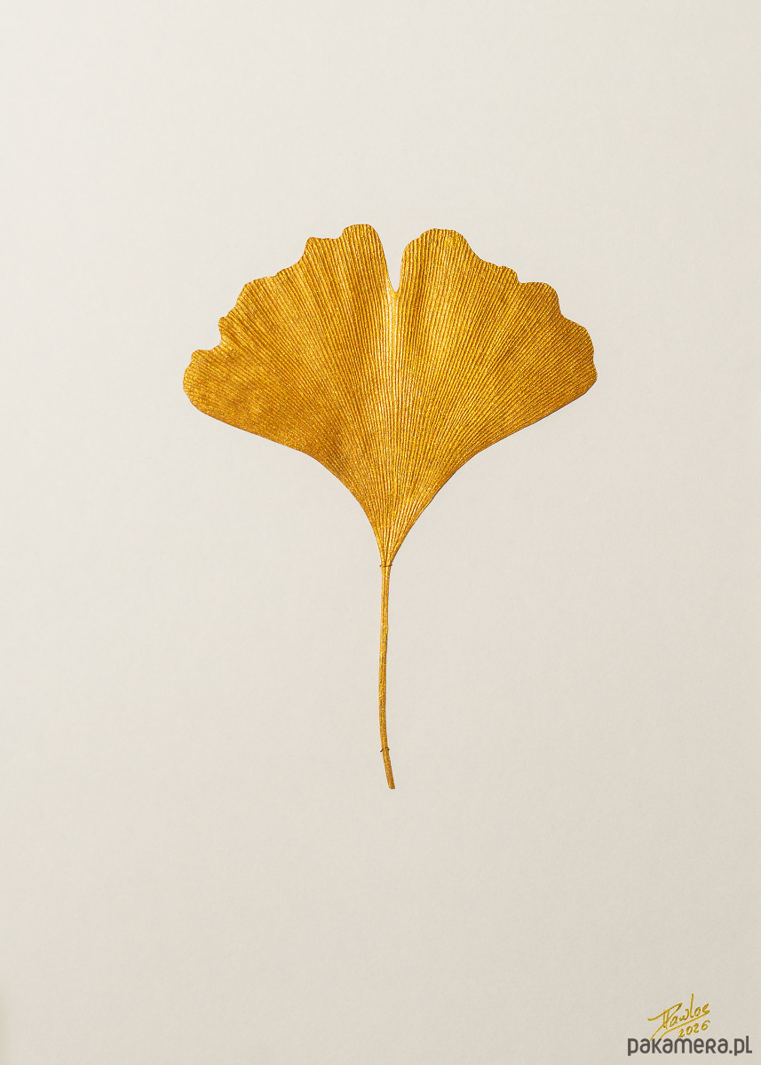 Ususzony prawdziwy liść Miłorzębu dwuklapowego/japońskiego (Ginkgo biloba L.) skąpany w artystycznym tuszu akrylowym w kolorze złotym i zabezpieczony klejem winylowym, który zapewnia wytrzymałą, elastyczną powłokę odporną na kruszenie.