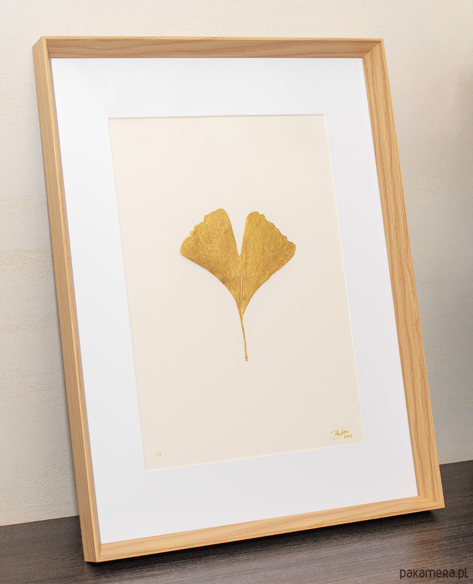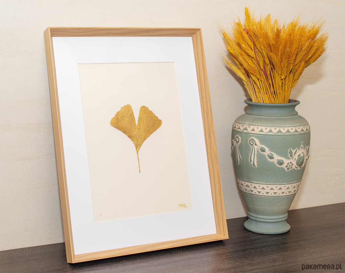 Ususzony prawdziwy liść Miłorzębu japońskiego (Ginkgo biloba L.) skąpany w artystycznym tuszu akrylowym w kolorze złotym i zabezpieczony klejem winylowym, który zapewnia wytrzymałą, elastyczną powłokę odporną na kruszenie.