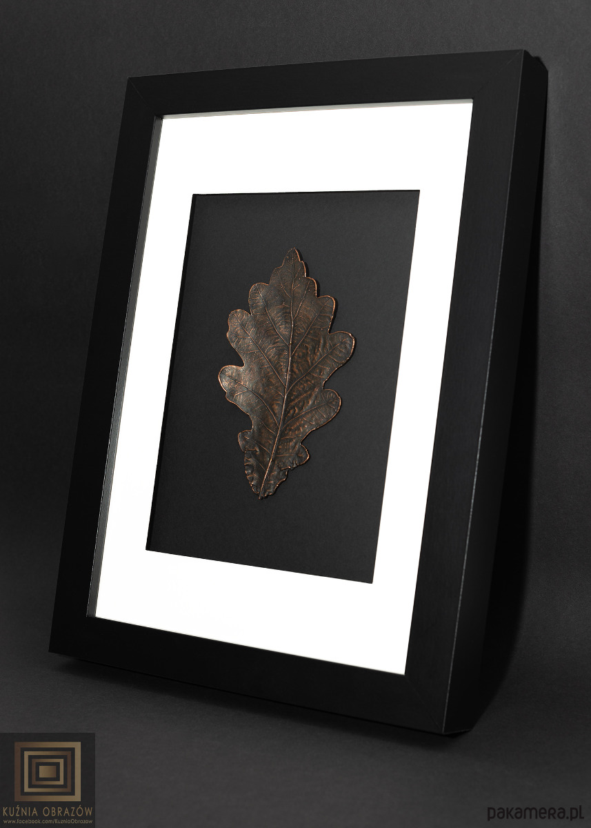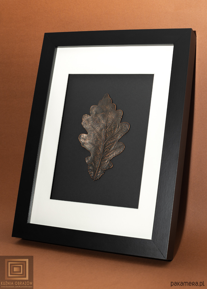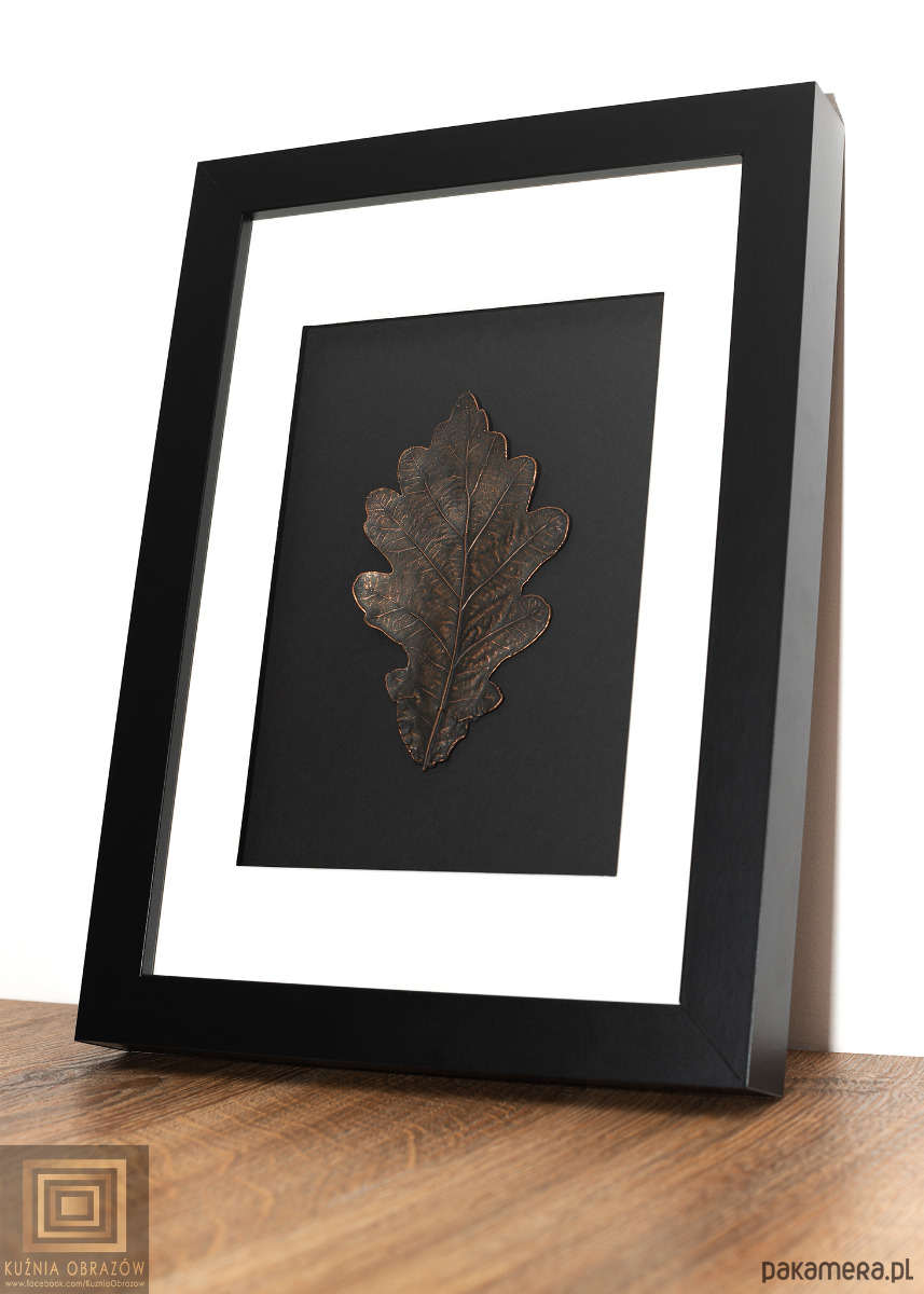 Miedziany liść dębu w nowoczesnej oprawie.