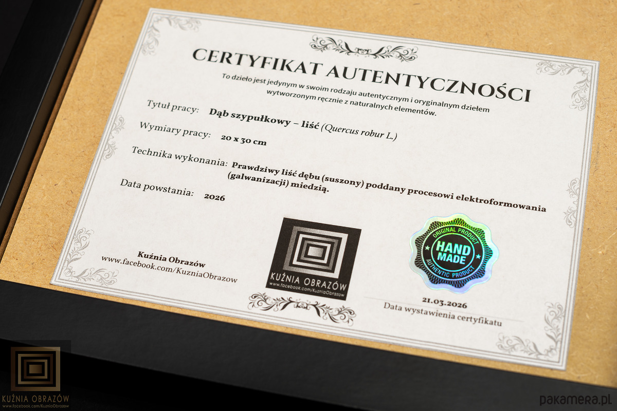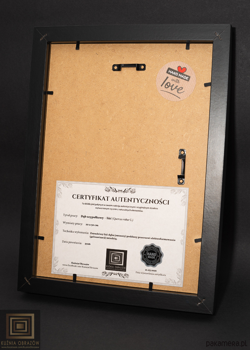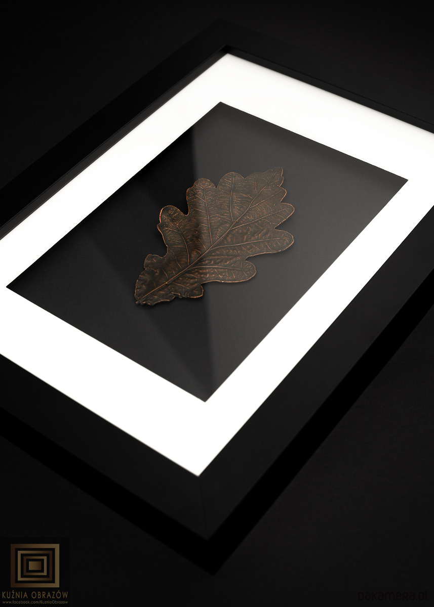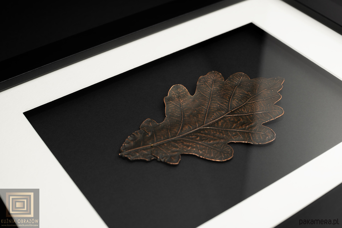Miedziany liść dębu w nowoczesnej oprawie.