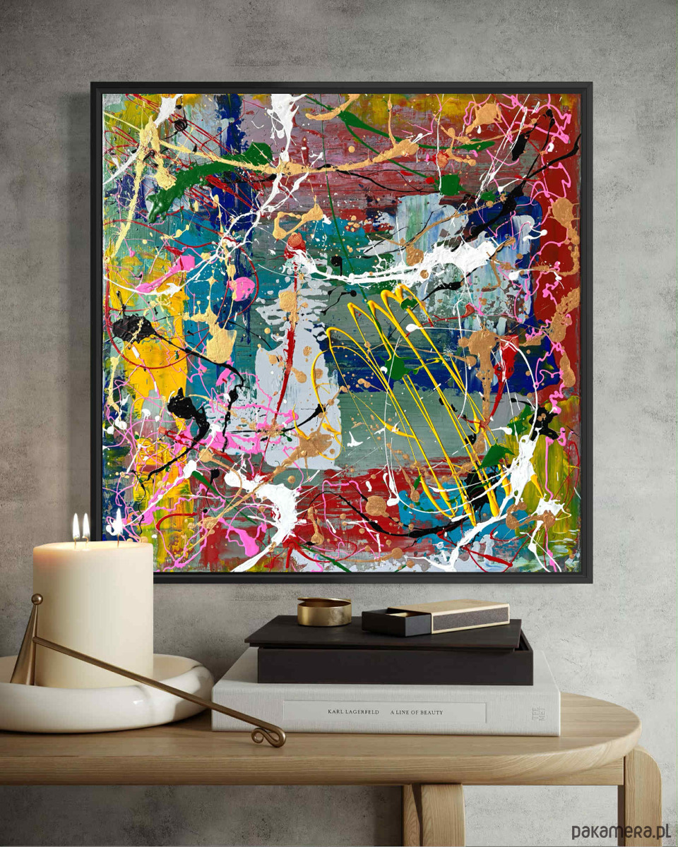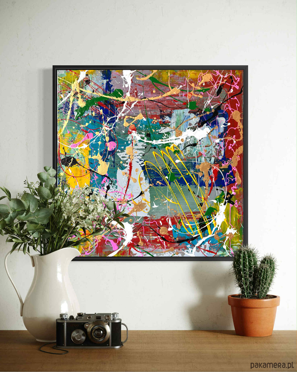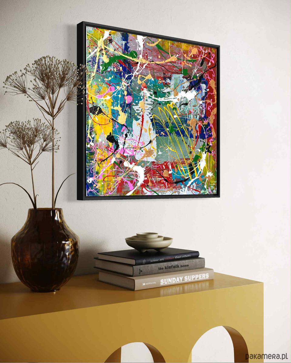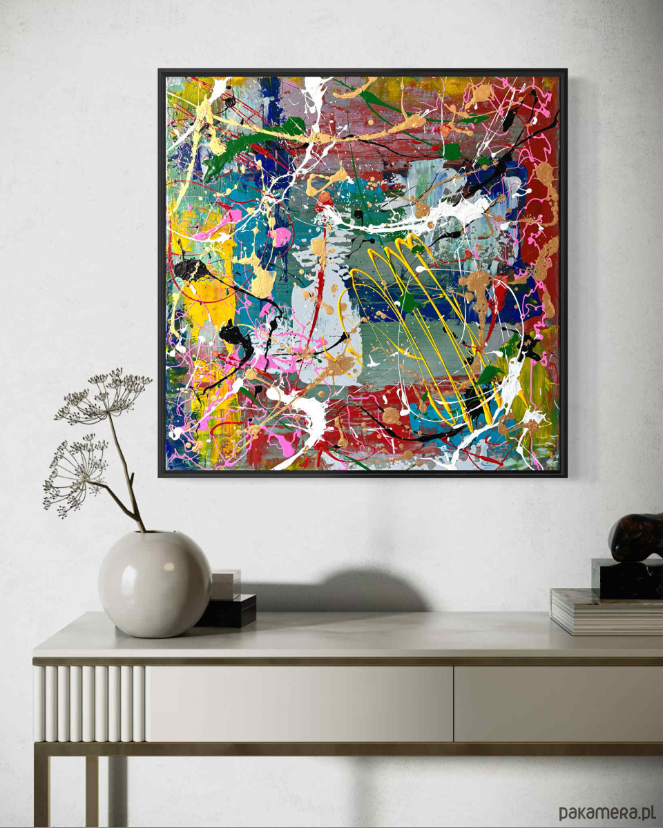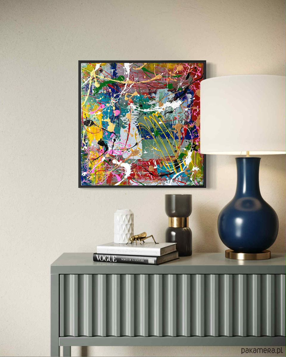 Żywe kolory kontrastują z neutralnym tłem, dzięki czemu dzieło przyciąga uwagę i staje się silnym akcentem przestrzeni. To obraz, który nie opowiada jednej historii — raczej zaprasza do dialogu. Może być interpretowany jako symbol wewnętrznej transformacji, kreatywnego impulsu lub procesu uwalniania emocji. Doskonale odnajdzie się w nowoczesnych wnętrzach, dodając im charakteru, dynamiki i artystycznej odwagi.