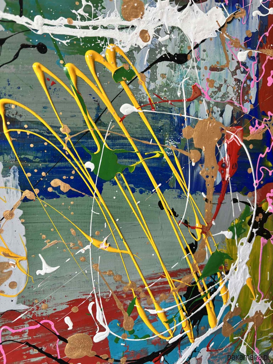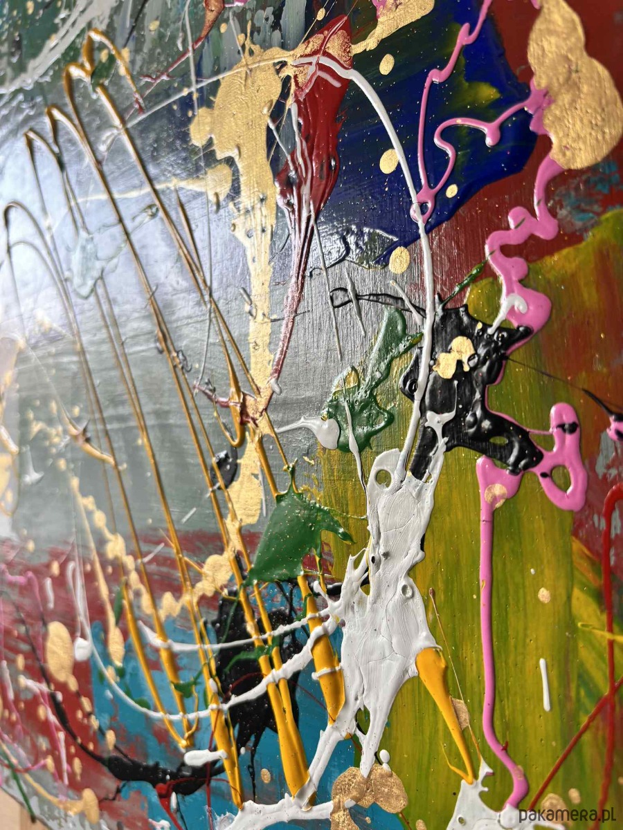 Obraz jest eksplozją koloru, ruchu i emocji, w której intuicyjny gest spotyka się z odwagą ekspresji. Warstwowa struktura farby, dynamiczne linie i spontaniczne rozpryski tworzą kompozycję pełną napięcia, ale i wewnętrznej harmonii. Intensywne czerwienie, turkusy, żółcie i zielenie przeplatają się z bielą i czernią, nadając całości rytm oraz głębię. Forma obrazu przypomina wizualny zapis energii — jakby był mapą emocji, myśli i doświadczeń nakładających się na siebie w jednym momencie. Chaos jest tu świadomy i kontrolowany, a każda plama i linia ma swoje miejsce w większej całości.