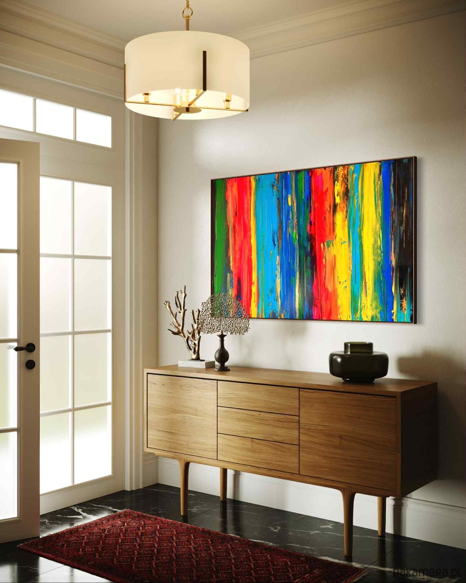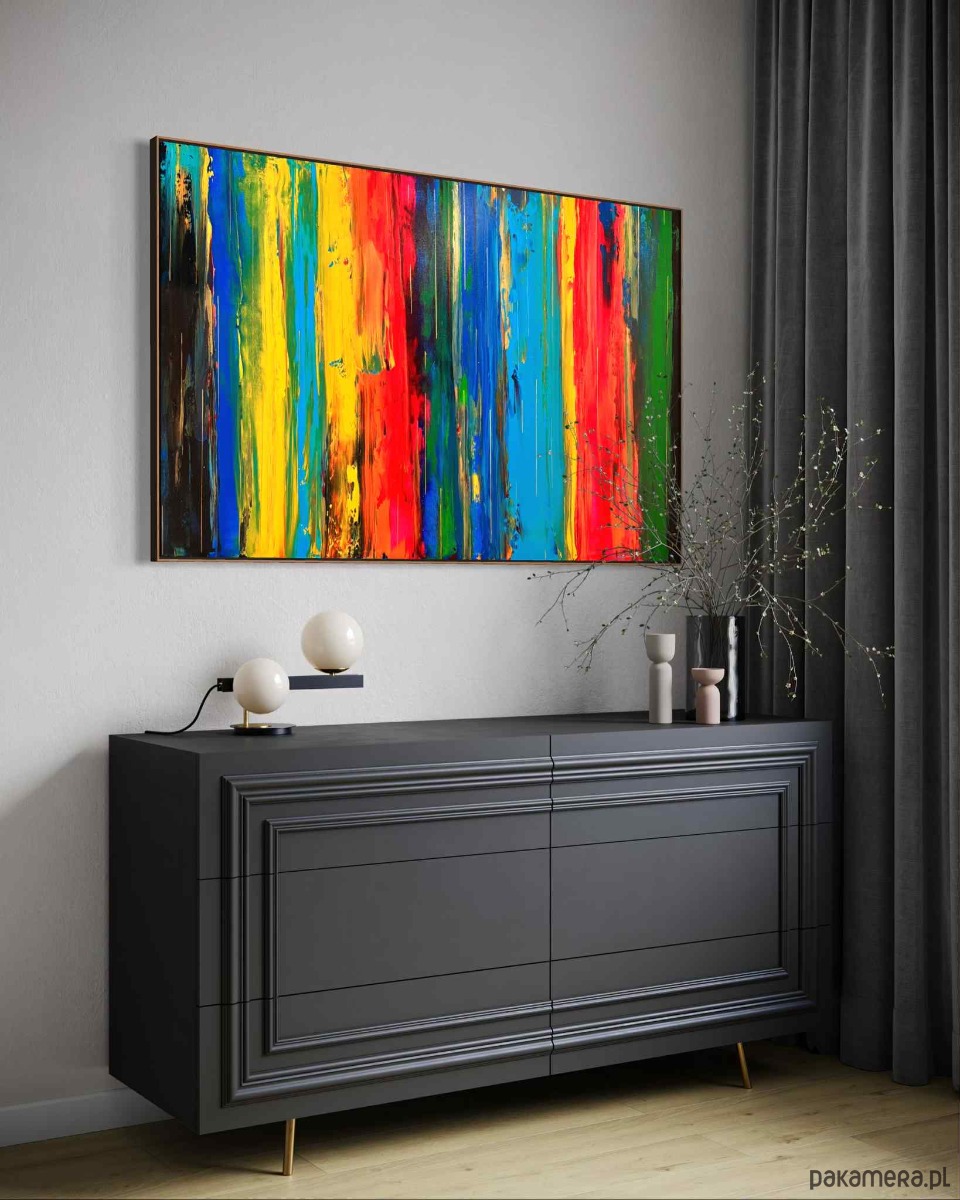 Abstrakcyjny obraz prezentujący energię zapisaną w kolorach. Wyrazista, wielobarwna kompozycja pasów, którą można powiesić w 4 różnych pozycjach.