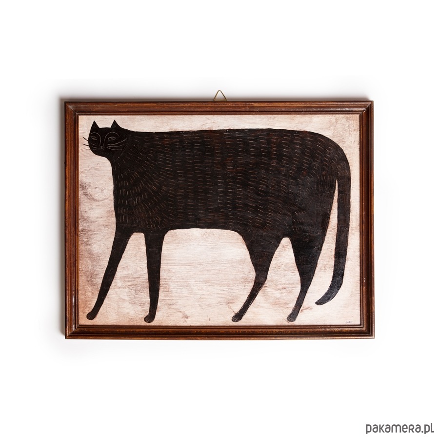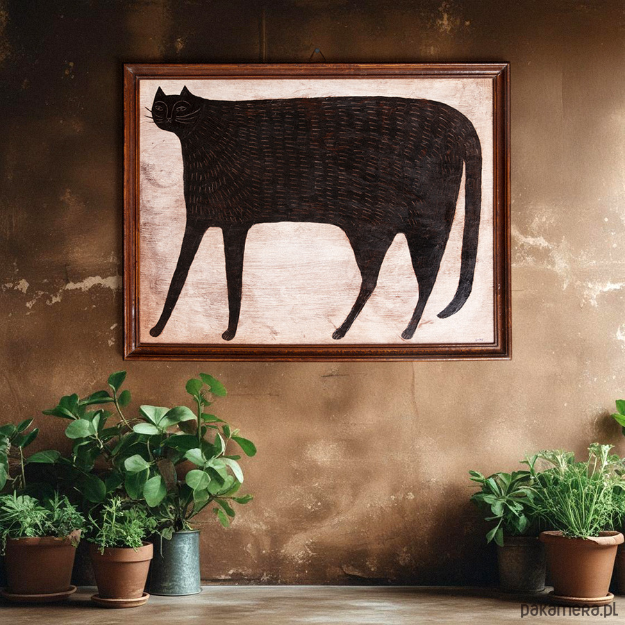 Oryginalny obraz „Czarny kot” w drewnianej ramce vintage.