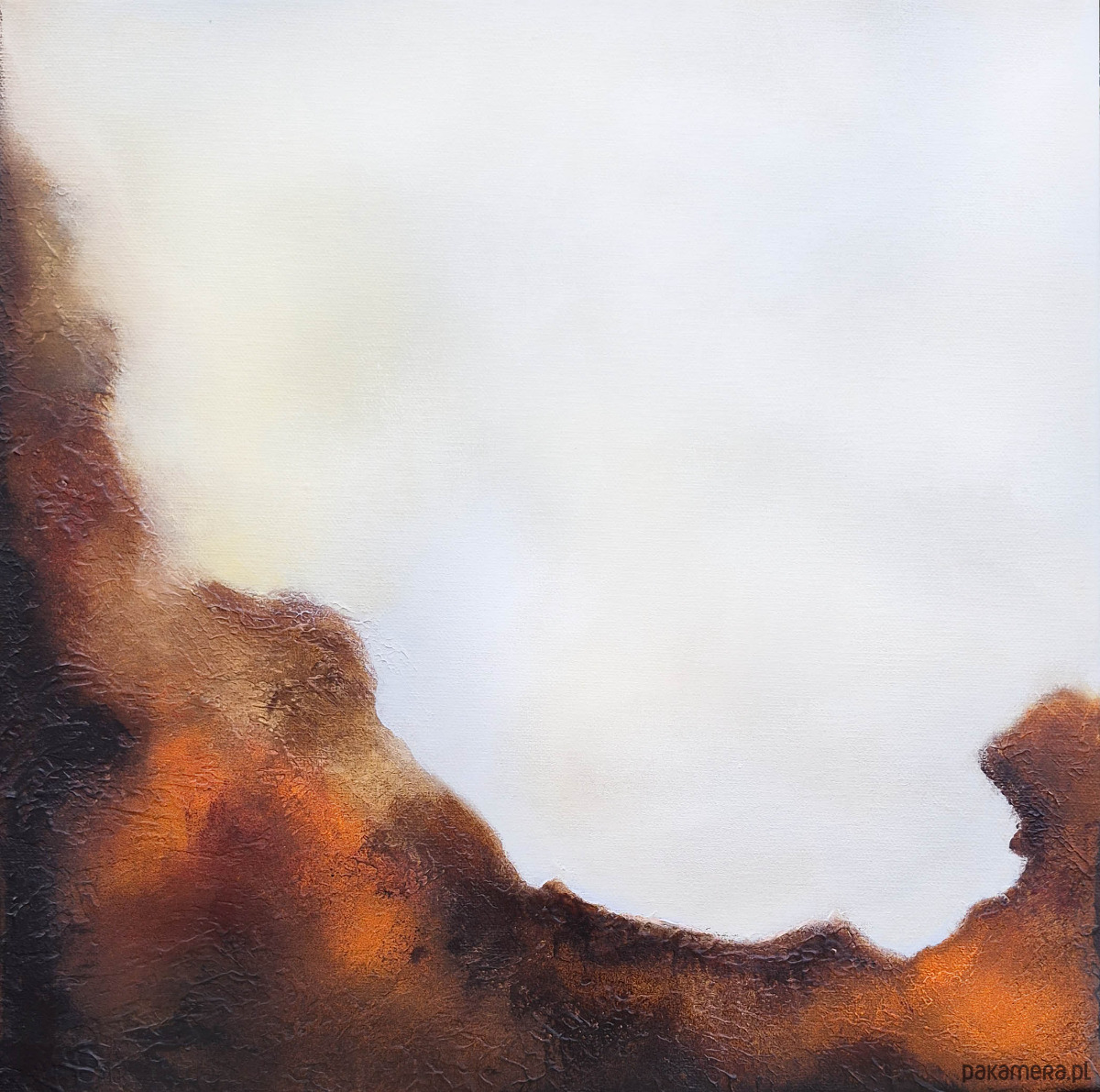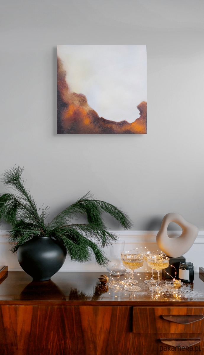 Wyraźna struktura farby nadaje powierzchni głębię i sprawia, że obraz zmienia się w zależności od światła oraz perspektywy. Warstwy i faktura budują subtelną dynamikę, dzięki której praca nie jest płaska — żyje w przestrzeni.