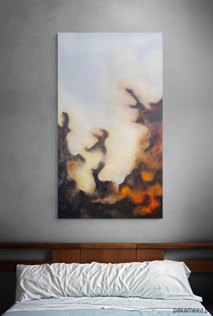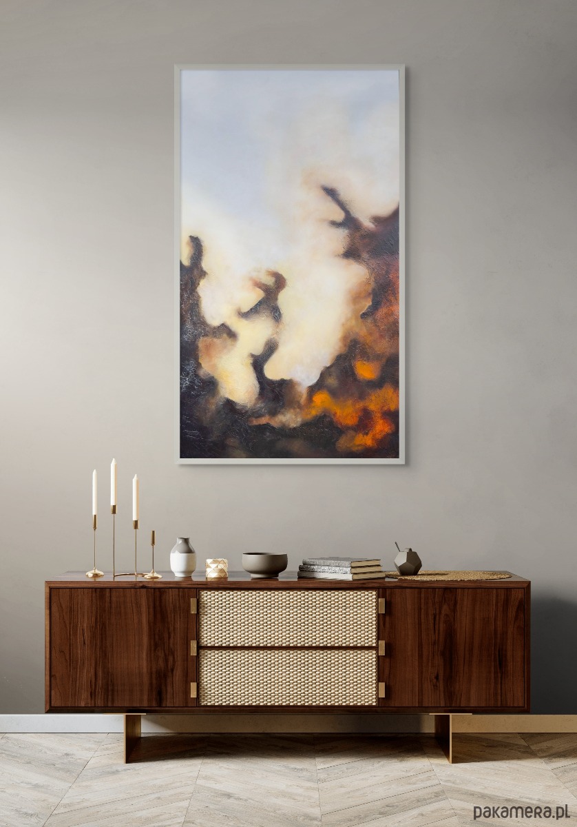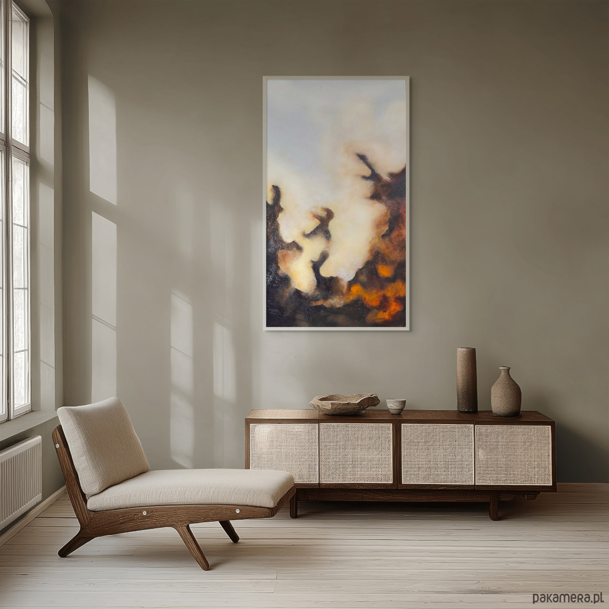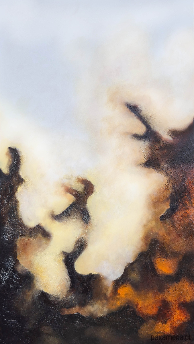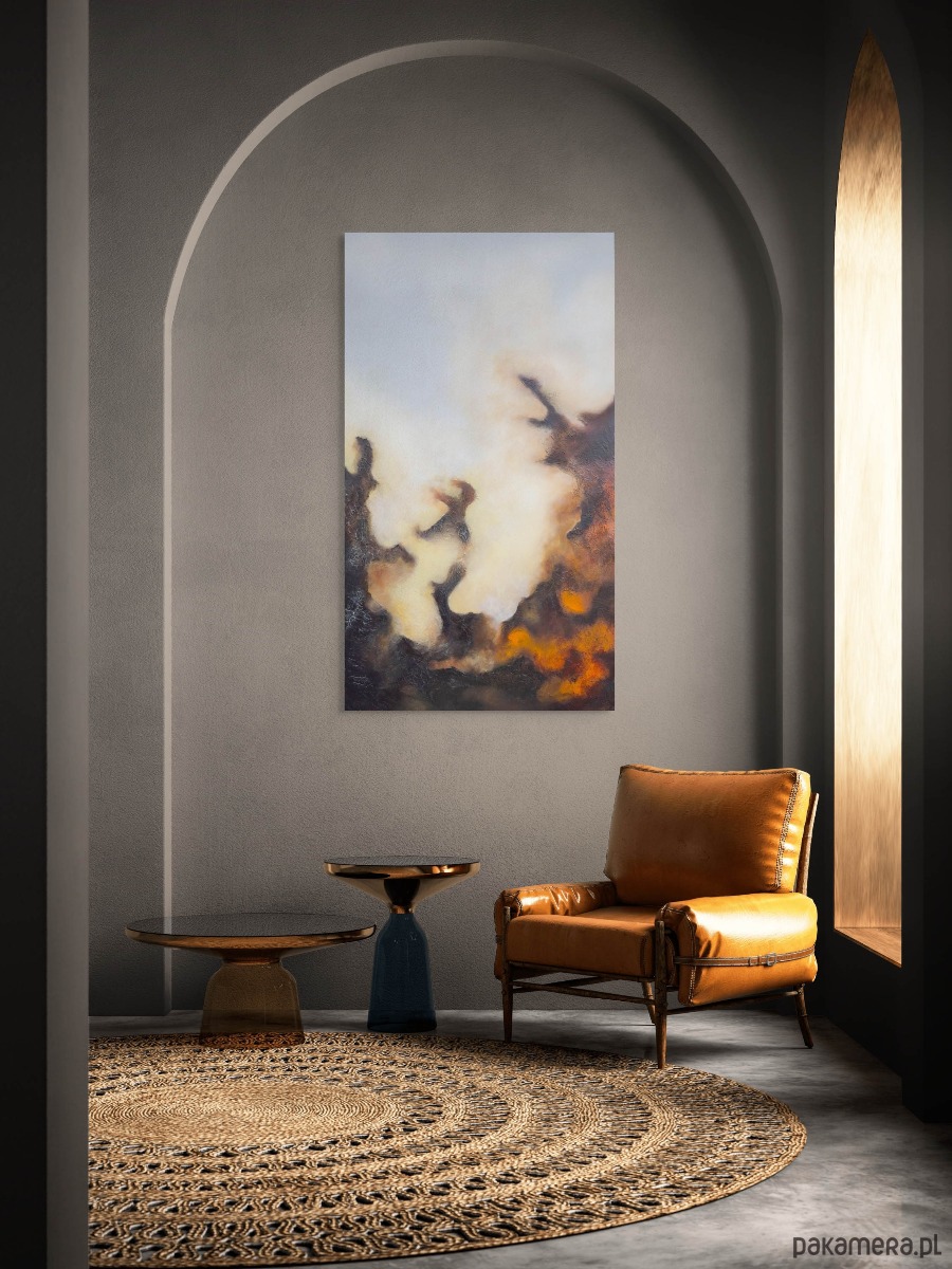 Wyraźna struktura farby nadaje powierzchni głębię i sprawia, że obraz zmienia się w zależności od światła oraz perspektywy. Warstwy i faktura budują subtelną dynamikę, dzięki której praca nie jest płaska — żyje w przestrzeni.