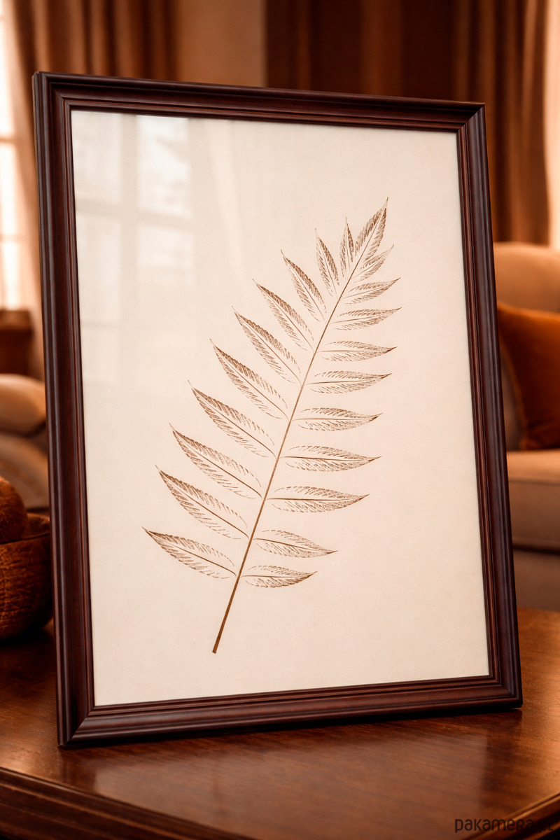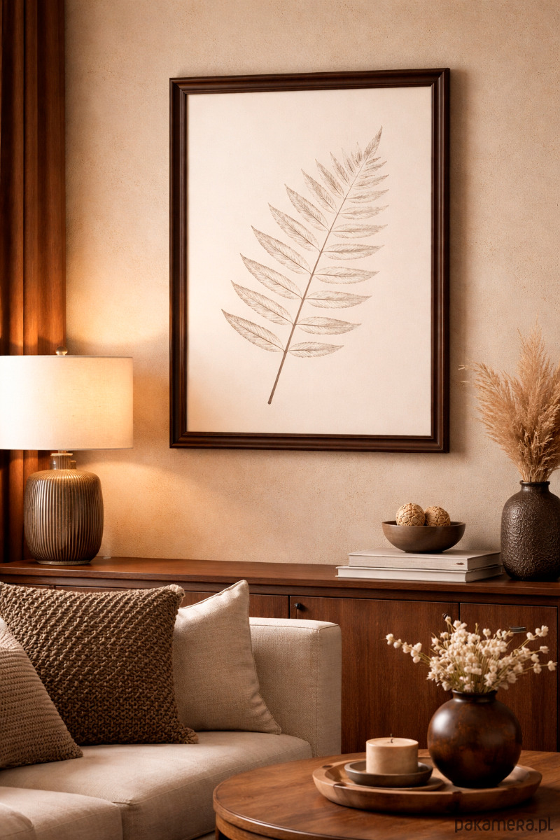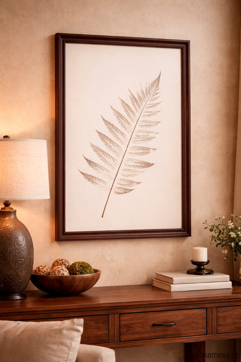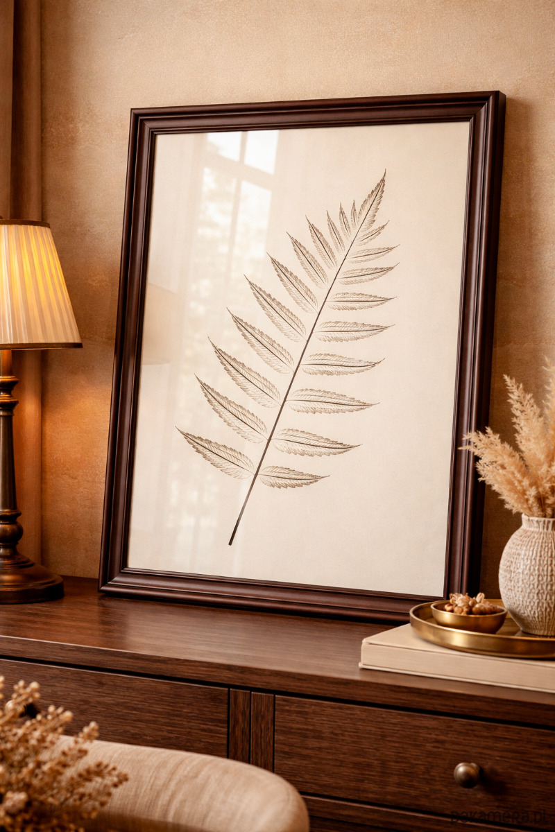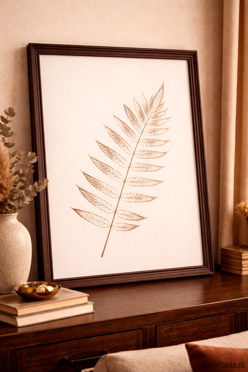 Obraz został oprawiony w frezowaną ramę (A3) w kolorze brązowym, która dodaje całości elegancji i sprawia, że dekoracja prezentuje się wyjątkowo stylowo. Minimalistyczny motyw roślinny nie przytłacza wnętrza, a jednocześnie stanowi efektowny akcent dekoracyjny.