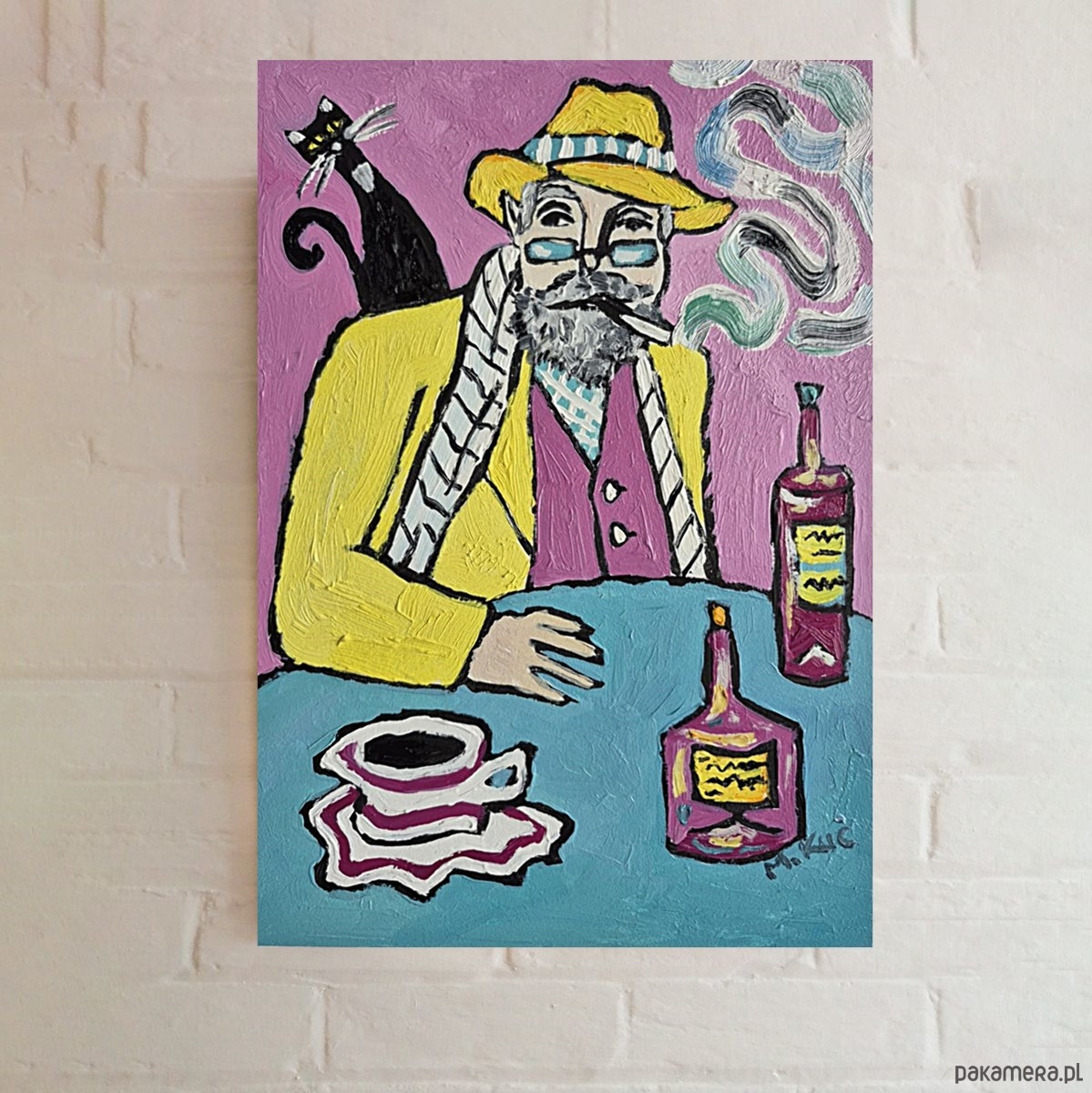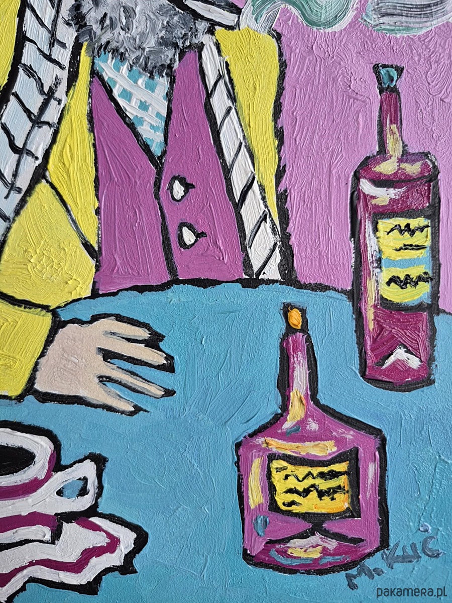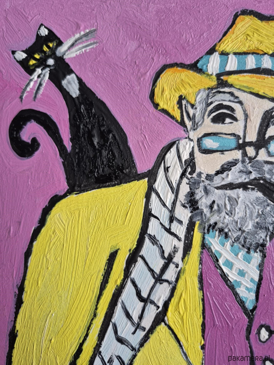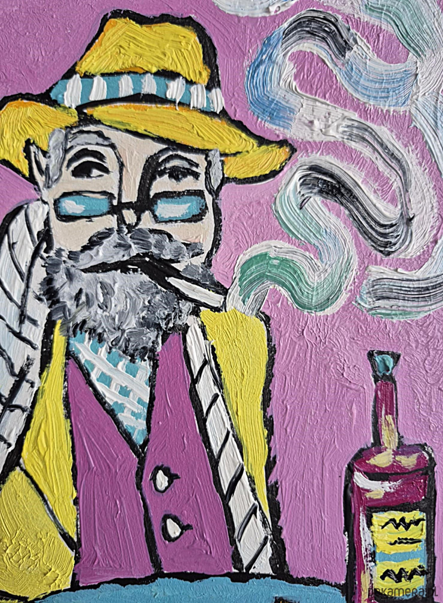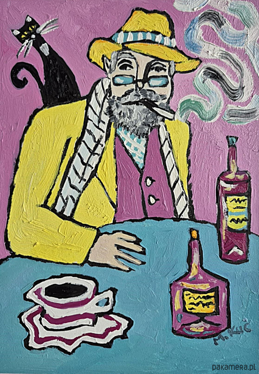 Obraz pulsuje intensywnymi kolorami i lekko ironiczną atmosferą. Na pierwszym planie siedzi mężczyzna o siwej brodzie i przenikliwym spojrzeniu, ubrany w żółty płaszcz i kapelusz, jakby wyjęty z innej epoki lub snu. Jego twarz, częściowo skryta za okularami, emanuje spokojem, ale i tajemnicą – to ktoś, kto dużo widział i jeszcze więcej przemilczał. Papieros w ustach wypuszcza miękkie, falujące smugi dymu, które unoszą się w różowej przestrzeni tła niczym myśli oderwane od rzeczywistości.