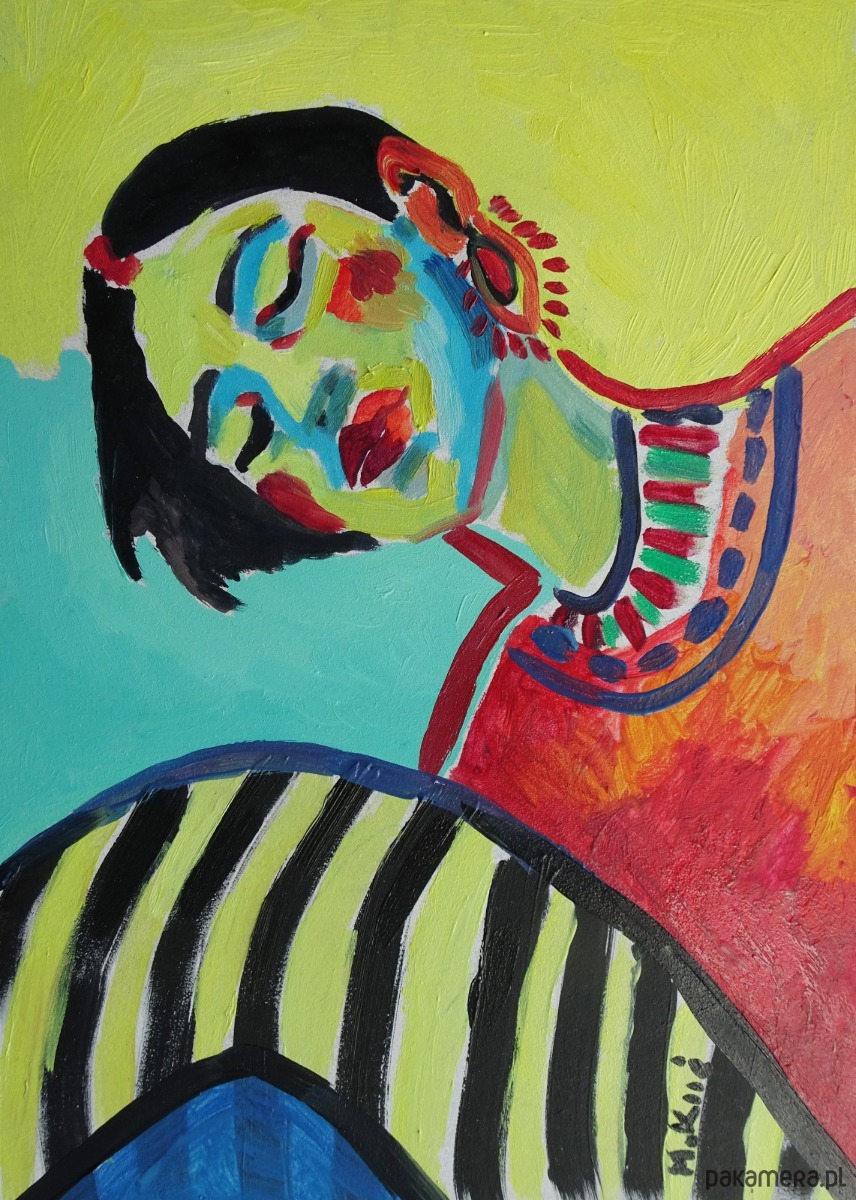 Obraz jest eksplozją kolorów i emocji, które natychmiast przyciągają wzrok. Tło w jaskrawej żółci i turkusie wywołuje wrażenie nieoczywistego, baśniowego świata. Centralna postać z zamkniętymi oczami zdaje się oddawać chwili relaksu lub melancholii. Żywe barwy, takie jak czerwony, niebieski i zielony, nadają obrazowi wyjątkową energię.