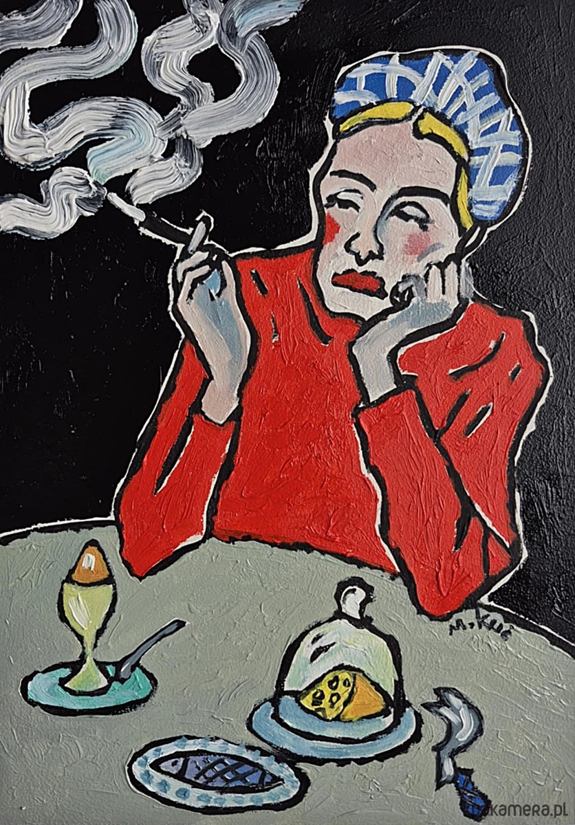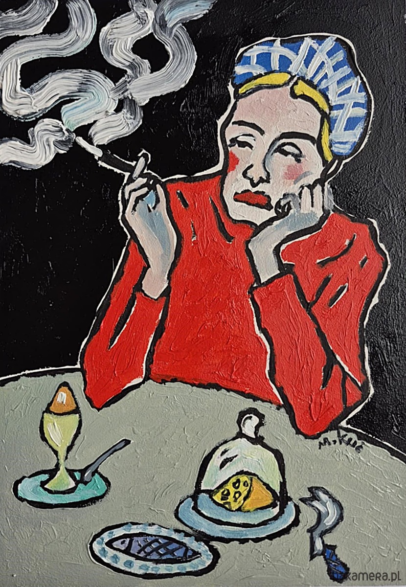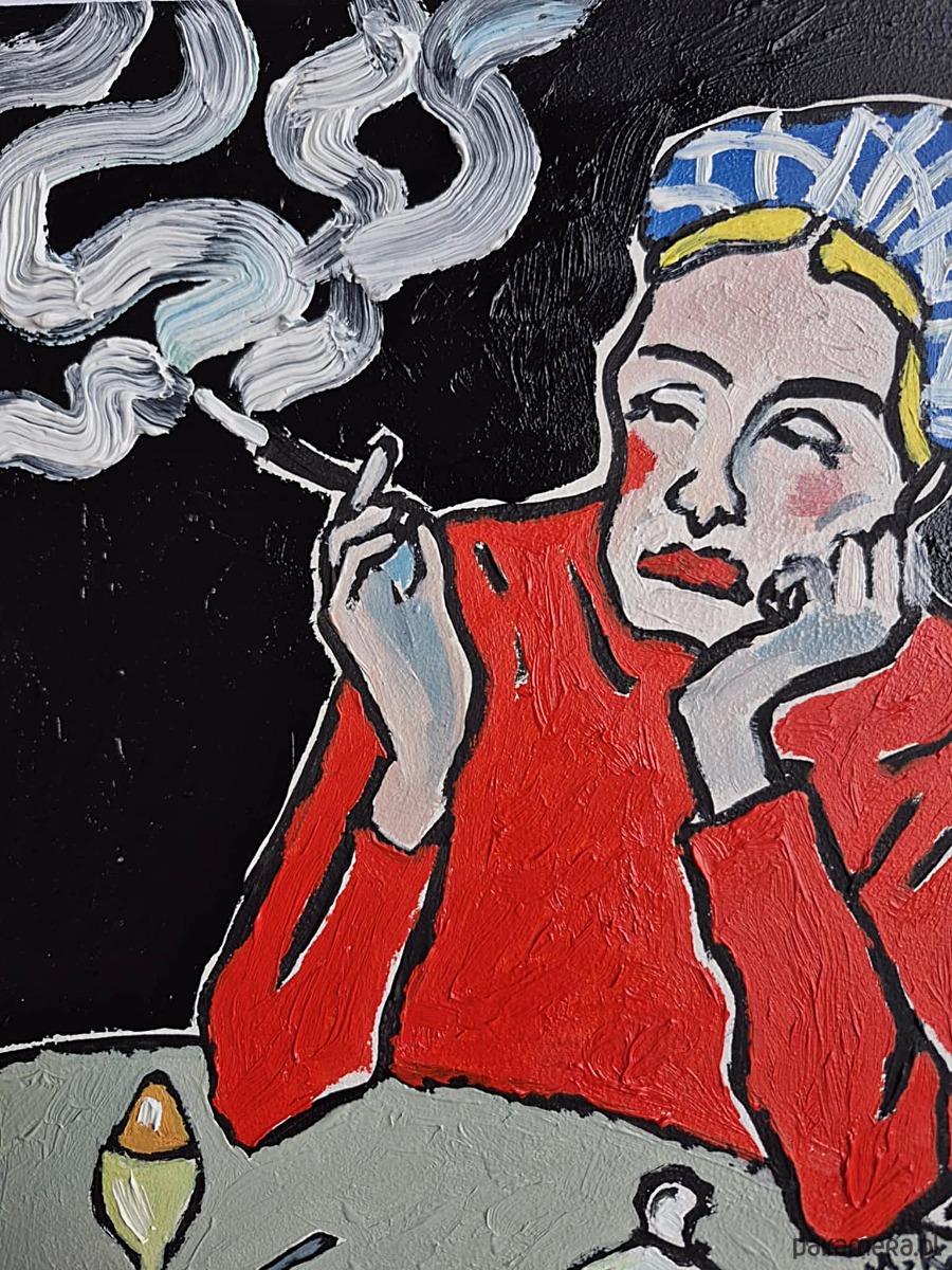 Dym z papierosa nie unosi się lekko — raczej wije się ciężko, grubą kreską, przypominając myśli, które nie potrafią znaleźć ujścia. Tworzy znaki, które niczego nie wyjaśniają, a jednak mówią wszystko. Oczy kobiety są półprzymknięte, nieobecne; patrzą gdzieś poza stół, poza chwilę.