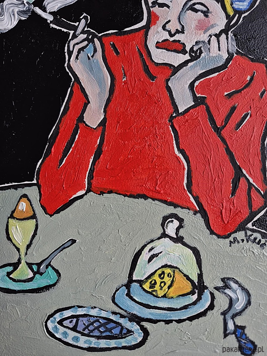 Na blacie: mała martwa natura codzienności. Kawałek sera pod kloszem, ryba na talerzu — symbole sytości, która nie daje spełnienia. Widelec porzucony niedbale, jakby rozmowa właśnie się skończyła albo nigdy się nie zaczęła.