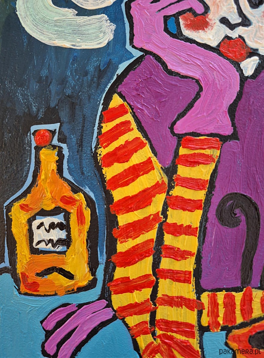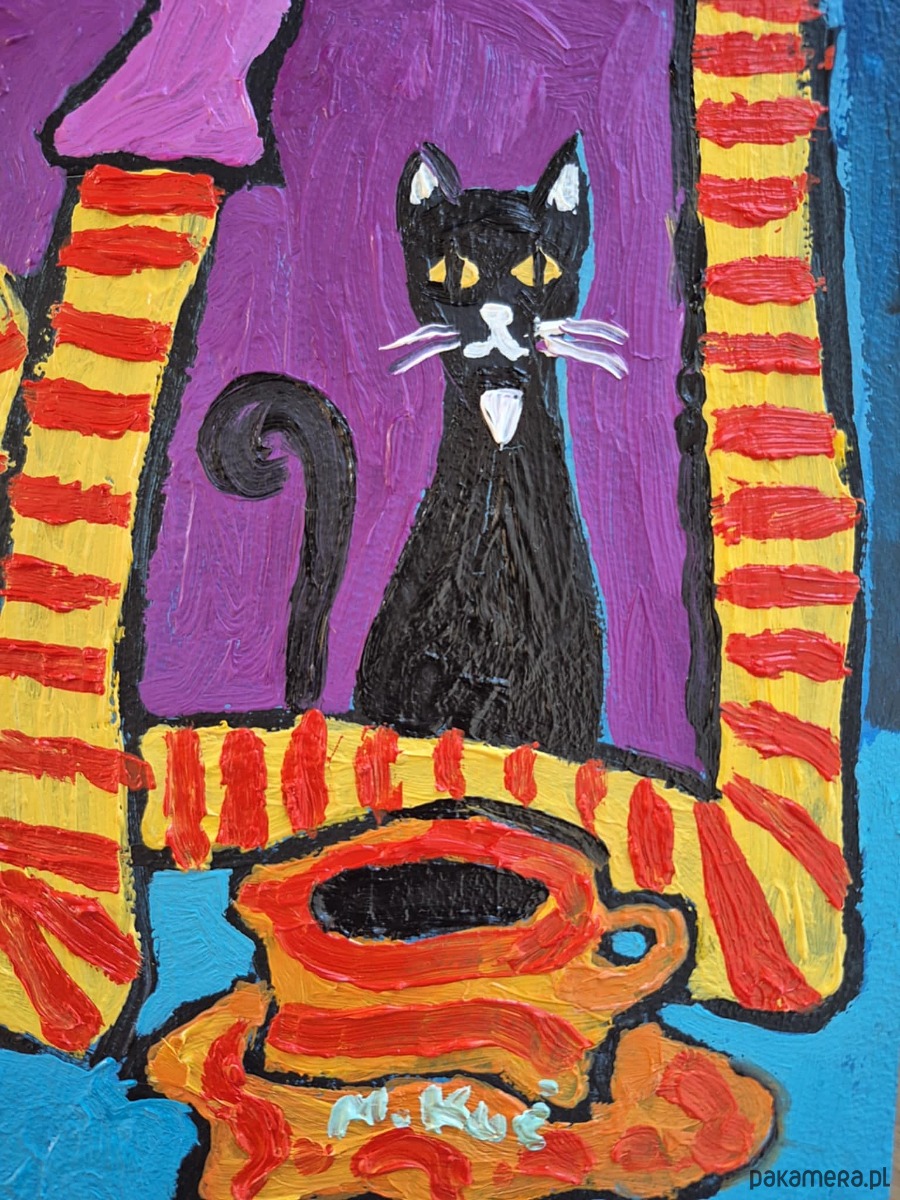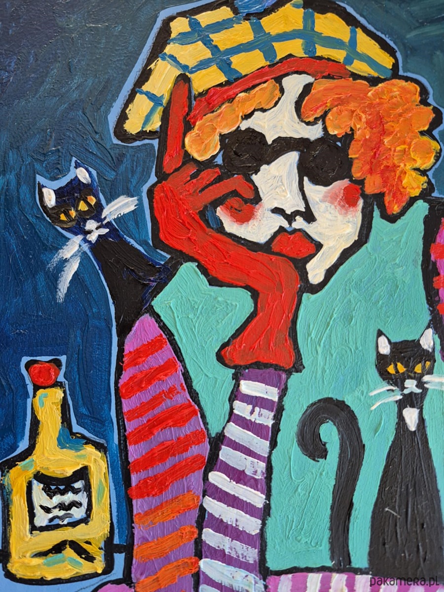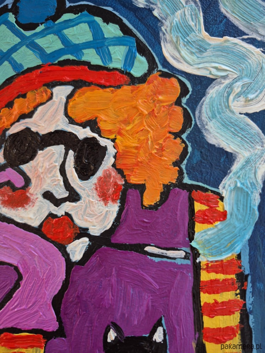 Kobieta ubrana jest w fioletowy sweter z mocno kontrastującymi, żółto-czerwonymi pasiastymi rękawami, które przyciągają wzrok i rytmizują kompozycję. Na jej piersi siedzi czarny kot, czujny i nieruchomy, jakby był alter ego bohaterki — symbolem samotności, niezależności lub nocnej ciszy.