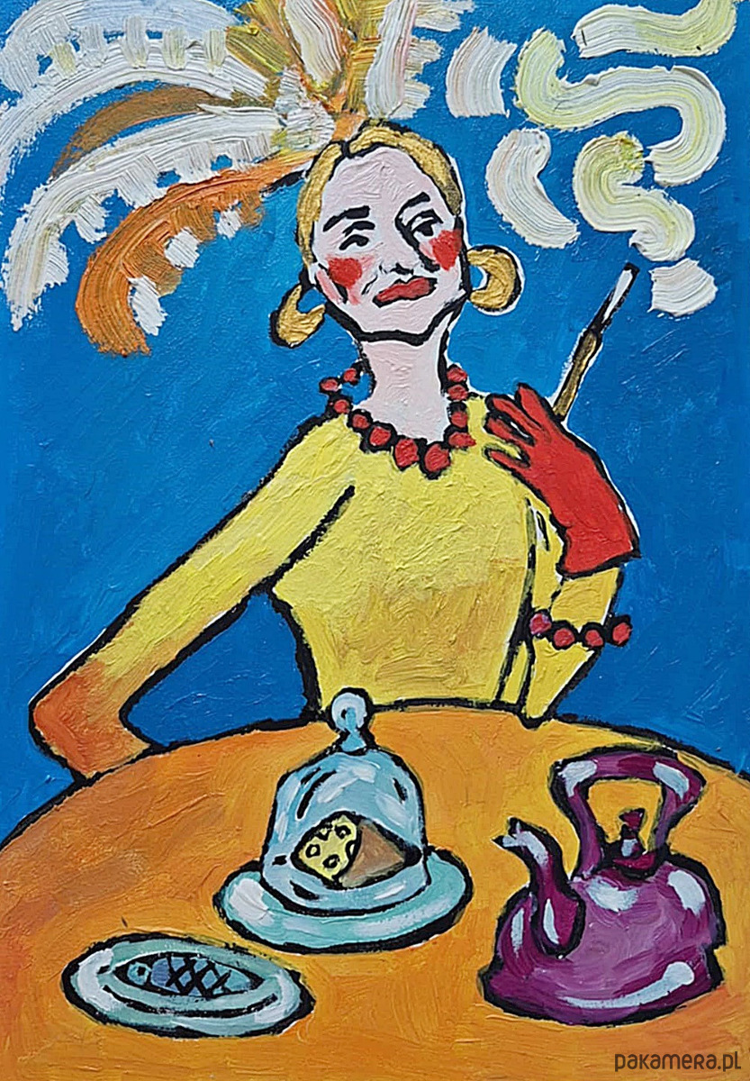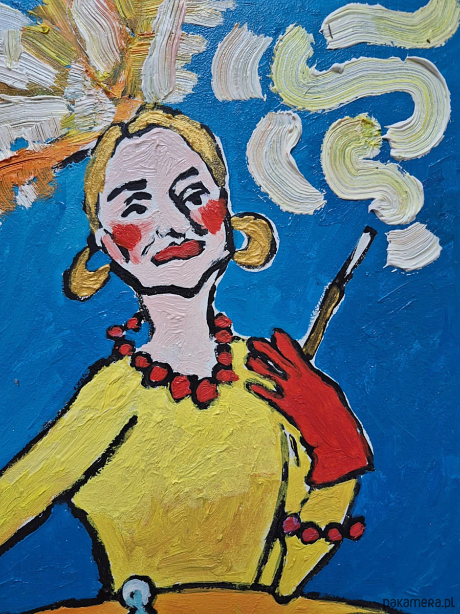 Kapelusz z piórami eksploduje nad głową kobiety jak myśl lub emocja — pióra nie są realistyczne, raczej symboliczne, falujące, jakby były zapisem ruchu lub nastroju. Czerwona rękawiczka, trzymająca papierosa, wprowadza motyw elegancji i dekadencji, przywodząc na myśl kawiarniany rytuał, chwilę zawieszoną między codziennością a pozą.