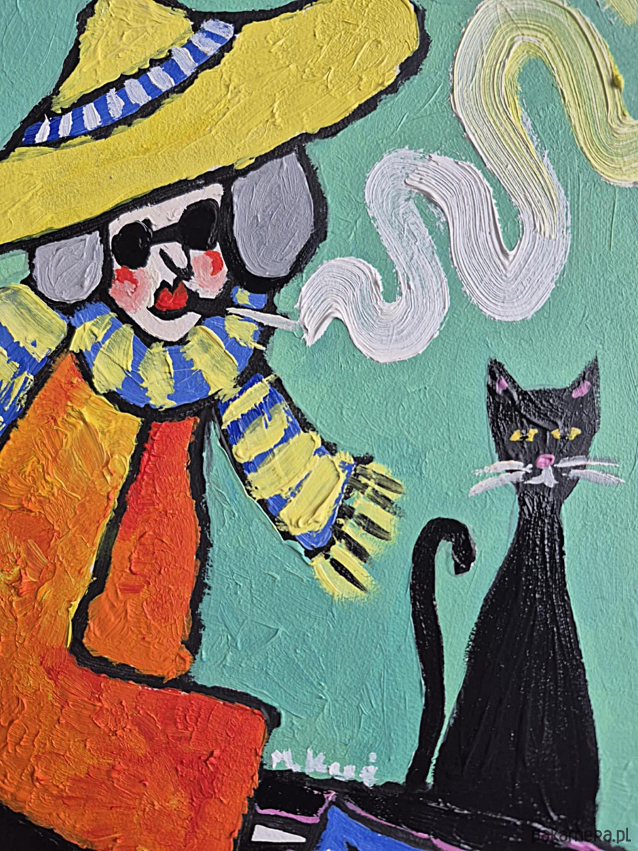 Towarzyszą mu koty – czarne, czujne, smukłe. Jeden wspina się w tle, drugi siedzi naprzeciwko, patrząc niemal z osądem. Są jak strażnicy ciszy, symbole niezależności, może alter ego bohatera. Ich oczy błyszczą, jakby wiedziały więcej niż mówią.