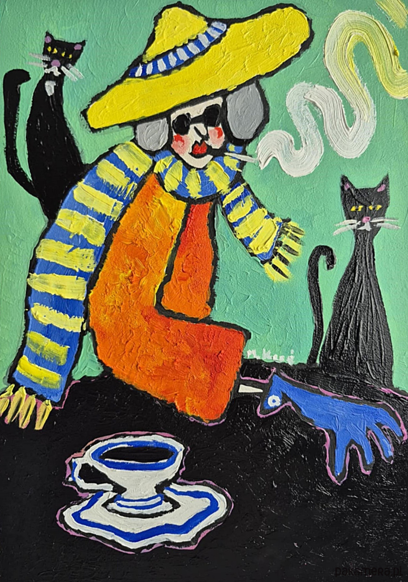 To obraz jak sen opowiedziany grubą, pewną kreską i farbą kładzioną bez wahania. W centrum siedzi postać o twarzy maski – trochę klaun, trochę wędrowiec – w ogromnym żółtym kapeluszu, który zdaje się być zbyt ciężki dla rzeczywistości. Ubrana w pasiasty, niebiesko-żółty szalik i ognisto pomarańczowy płaszcz, wygląda jak ktoś, kto przyszedł z innego świata, gdzie kolory mają własny głos.