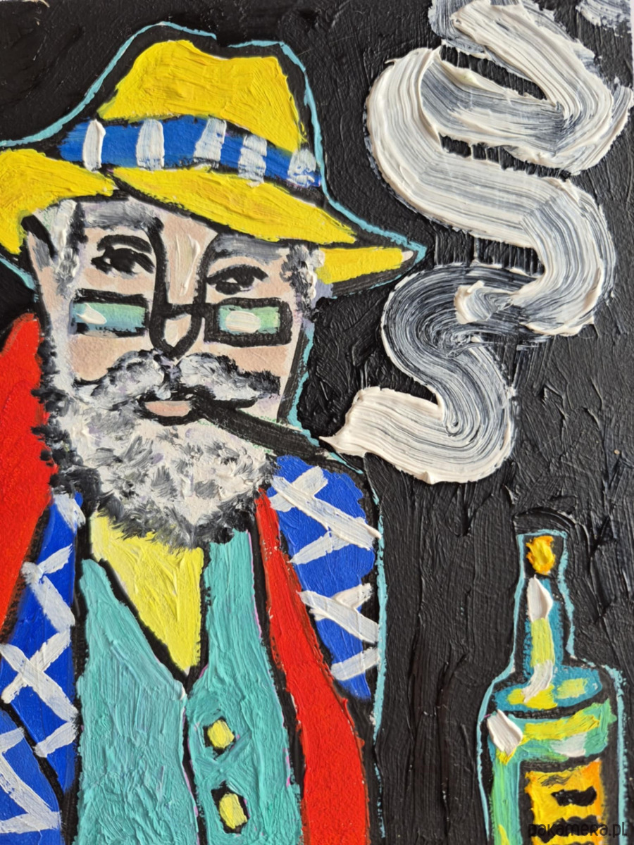 Na stole leżą przedmioty codzienne: filiżanka, butelki alkoholu. Nie są one jednak realistyczne — uproszczone, ciężkie od farby, stają się znakami: samotności, rytuału, może ucieczki. Dym unoszący się z cygara rysuje się grubą, białą smugą na czarnym tle, jak materializacja myśli lub wspomnień.
