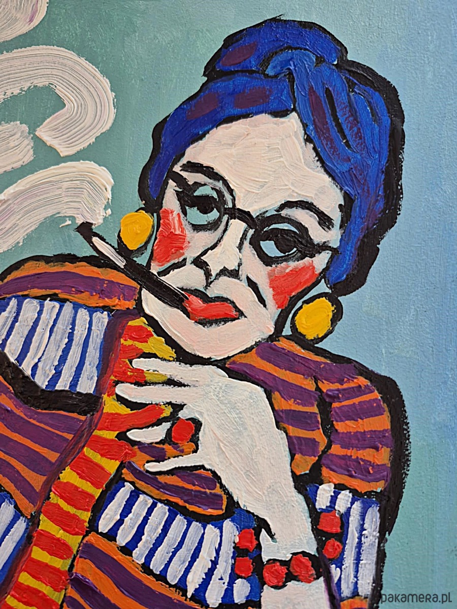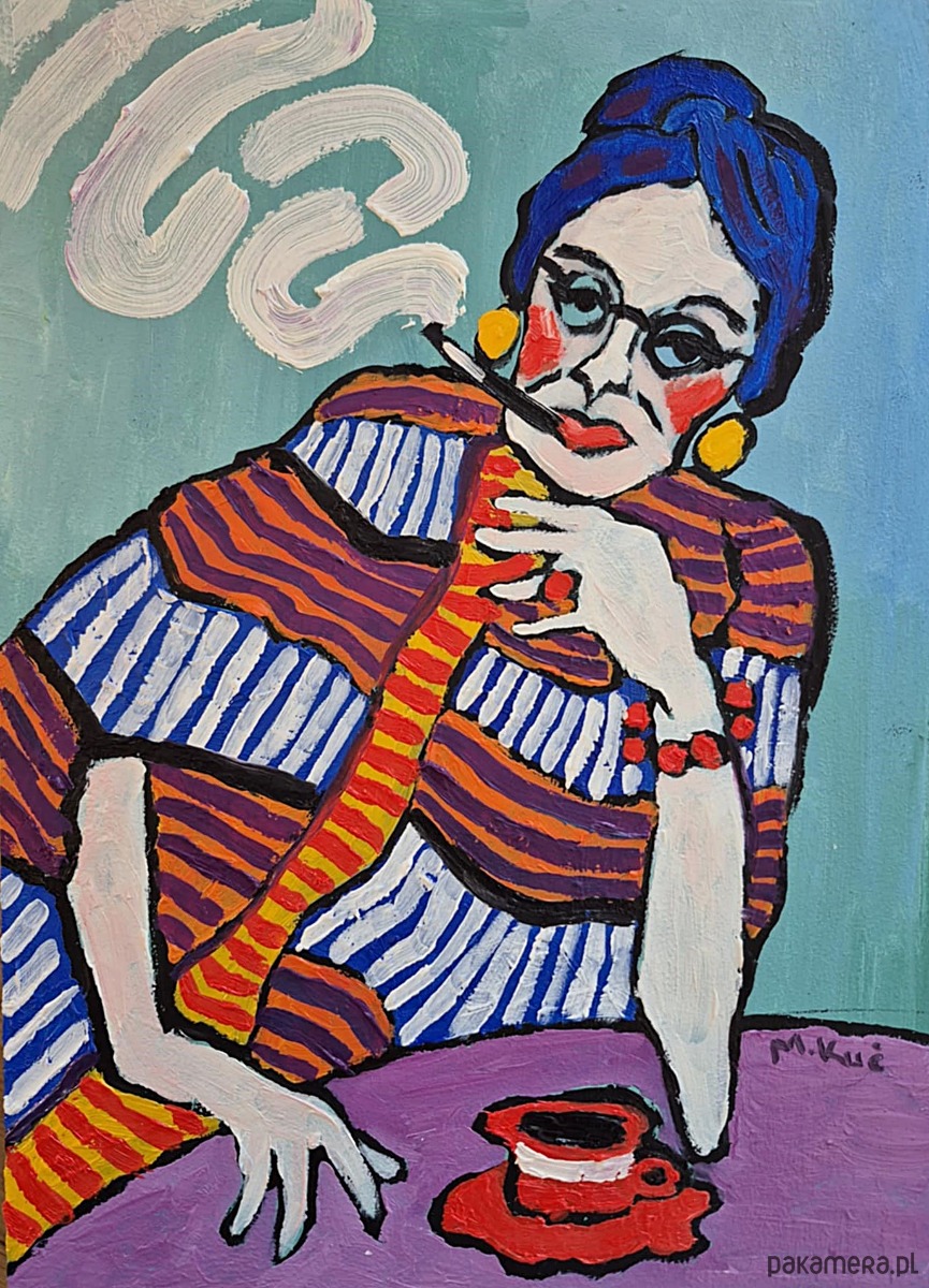 Twarz jest spokojna i zmęczona jednocześnie. Rumieńce nie są rumieńcami — to ślady życia, może wstydu, może pasji, może czegoś, co już się wydarzyło. Spojrzenie zza okularów nie szuka widza patrzy obok, w głąb własnego milczenia. Papieros jest cienką granicą między oddechem a ucieczką, między byciem tu a byciem gdzie indziej.