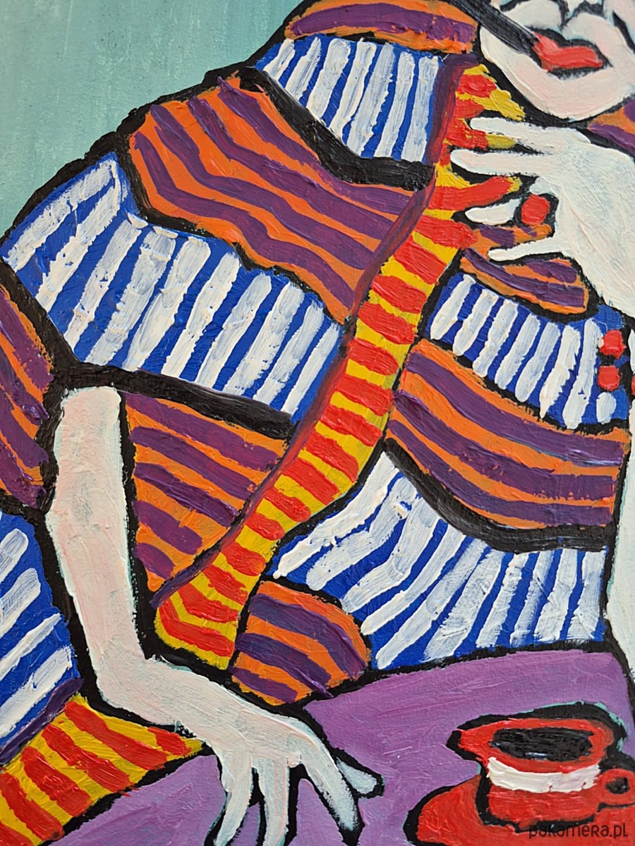 Obraz namalowany olejami na płycie 21/29 cm, sygnowany z przodu. Jest to moja autorska kompozycja. Świetnie może być eksponowany w nowoczesnych wnętrzach o stonowanej kolorystyce. Swoimi barwami może rozjaśnić takie wnętrza, w oświetleniu dziennym, jak i sztucznym. Idealny na prezent