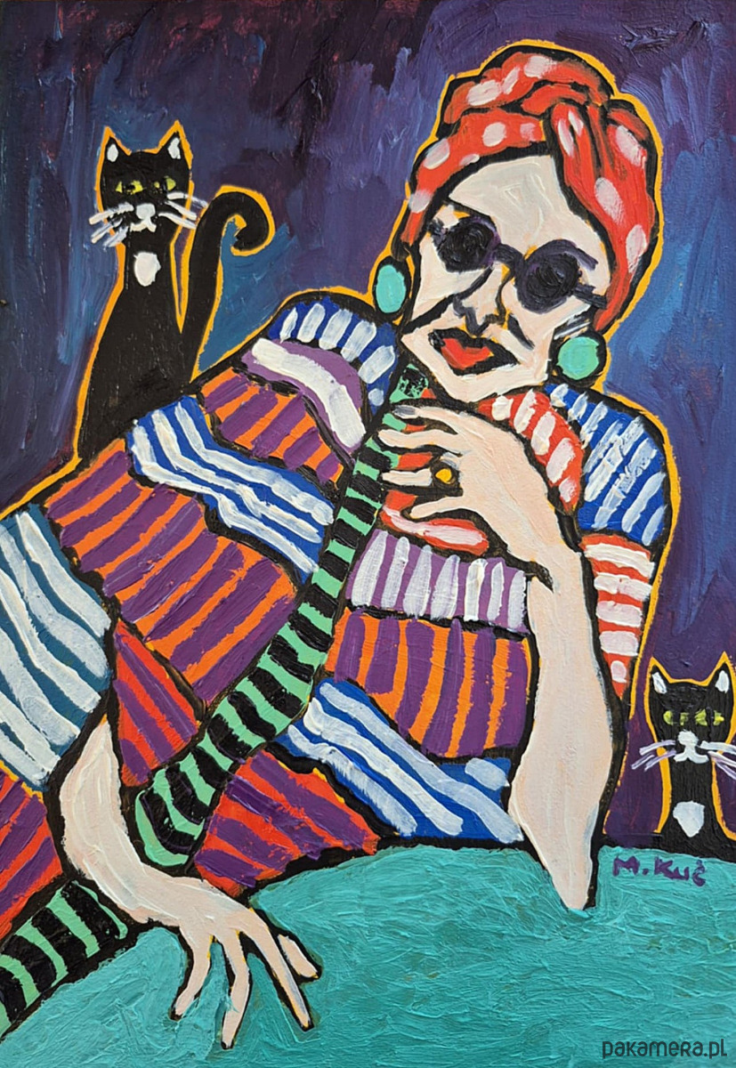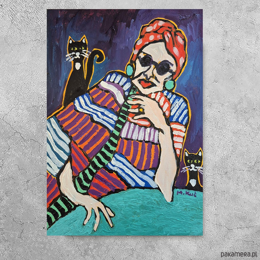 Towarzyszą jej dwa czarne koty — niemal strażnicy ciszy. Jeden stoi za jej plecami, drugi z boku, obaj o zielonkawych, czujnych oczach. Są stylizowani, symboliczni, z białymi plamkami na piersi, jak znaki rozpoznawcze. Wnoszą do obrazu nutę tajemnicy, niezależności i lekkiego humoru