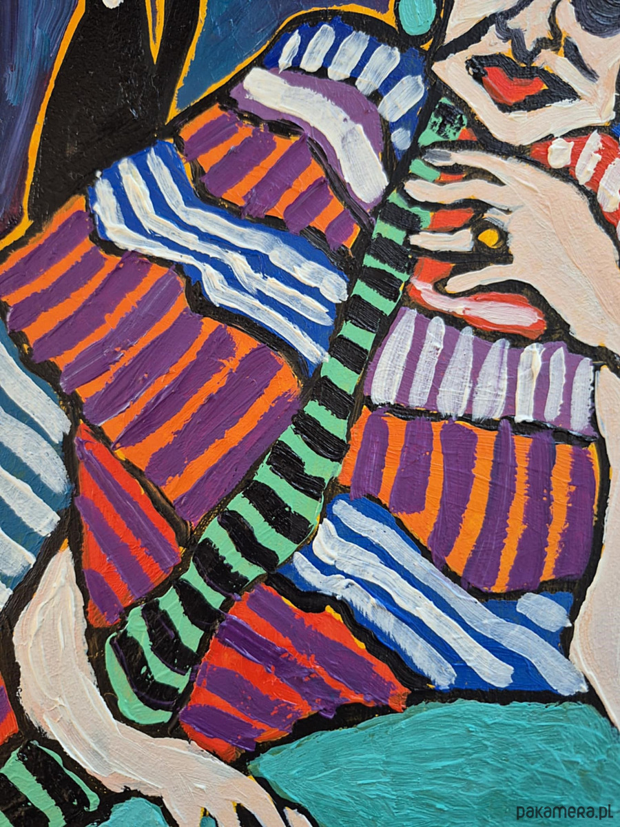 Postać ubrana jest w barwną, pasiastą suknię — rytmiczne pasy czerwieni, fioletu, błękitu, zieleni i bieli pulsują na płótnie, tworząc wrażenie ruchu i miękkości. Faktura farby jest wyraźna, gest pędzla odważny i szczery, co nadaje całości surową autentyczność. Kobieta opiera się o turkusową powierzchnię, jej dłoń wydaje się ciężka od myśli, jakby podtrzymywała nie tylko ciało, ale i nastrój chwili.