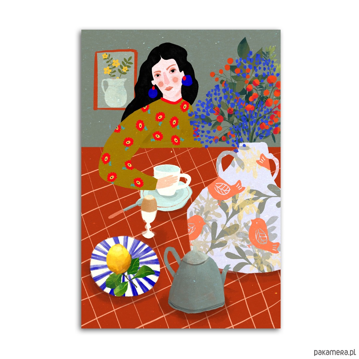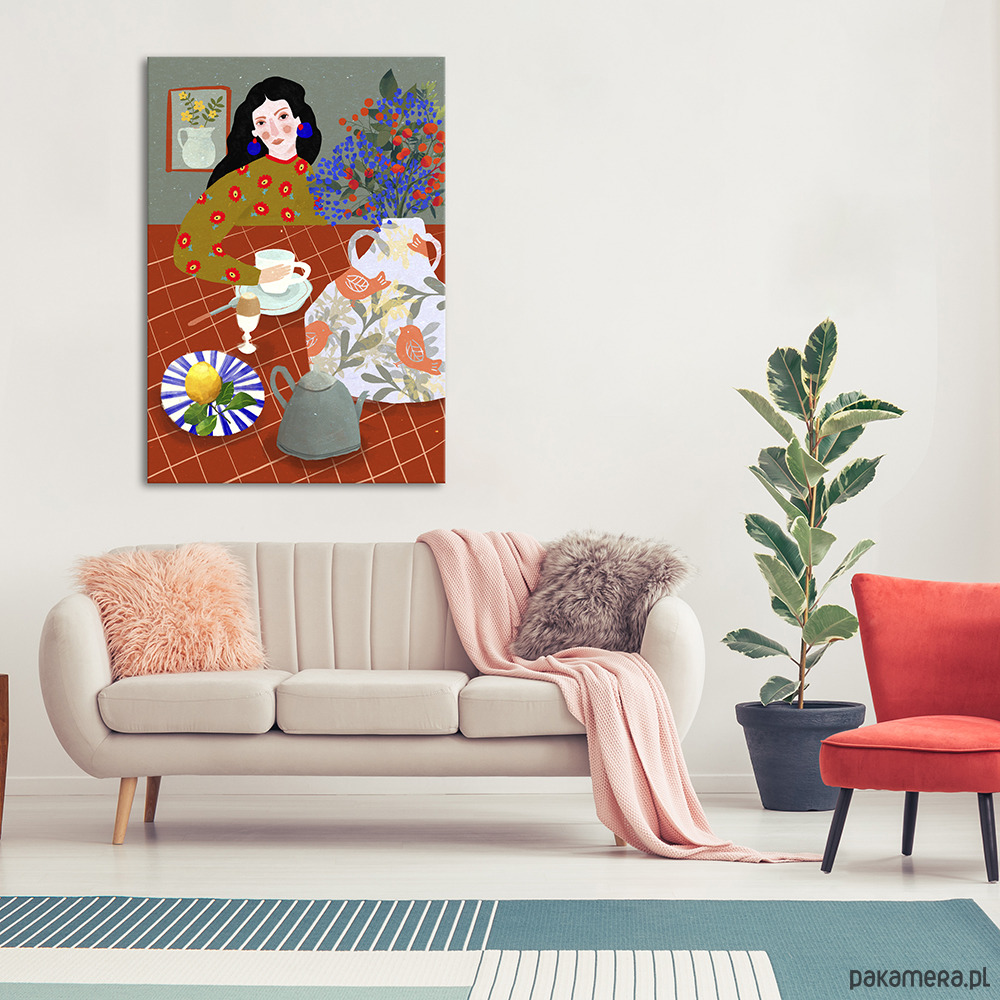 Obraz drukowany na płótnie canvas o wymiarach 70x100 cm przedstawia kolorową kompozycję z postacią przy stole. Wydruk wykonany w wysokiej rozdzielczości, zadrukowane boki nadają mu estetyczny wygląd bez potrzeby dodatkowej ramy.