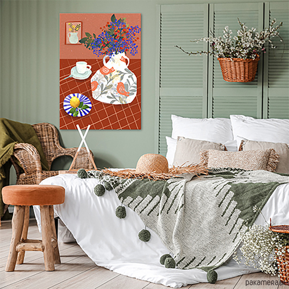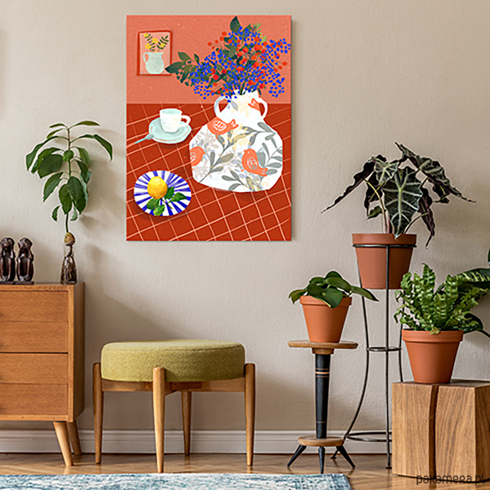 Obraz drukowany na płótnie canvas w formacie 70x100 cm przedstawia kolorową martwą naturę – bukiet drobnych kwiatów w dekoracyjnym dzbanie, filiżankę z łyżeczką oraz talerzyk z cytryną na tle ciepłego, ceglanego obrusu w kratkę. Całość utrzymana jest w stylu nowoczesnej ilustracji z nutą retro, pełna harmonii i przytulności. Obraz ma zadrukowane boki i jest gotowy do powieszenia, idealny do kuchni, jadalni lub salonu.