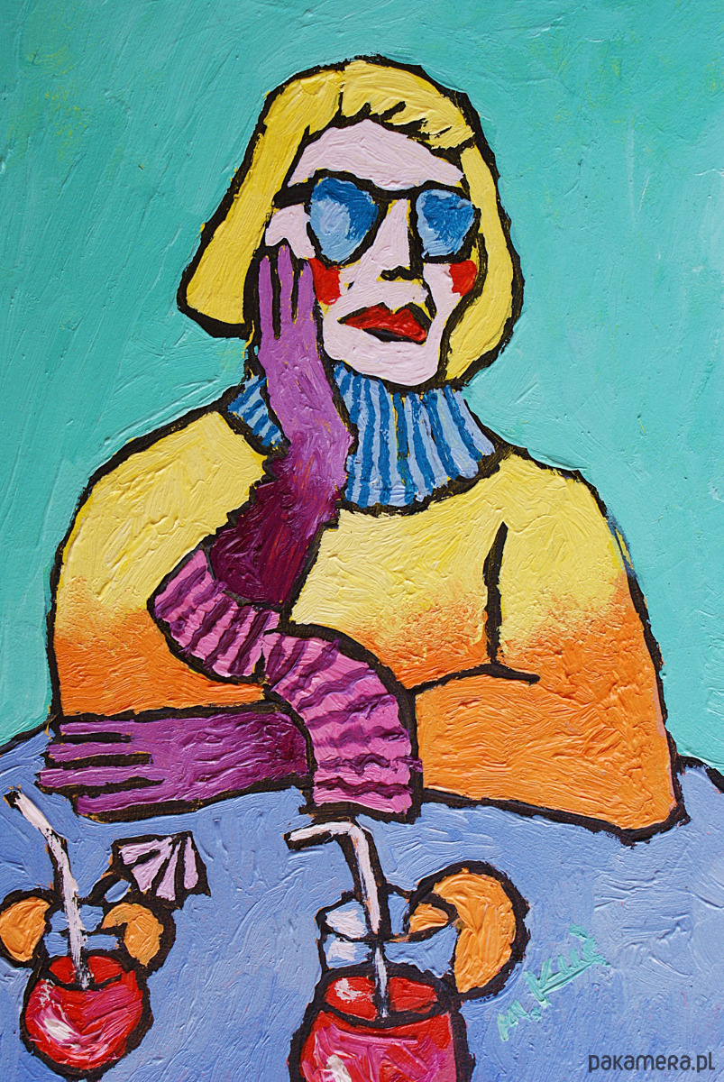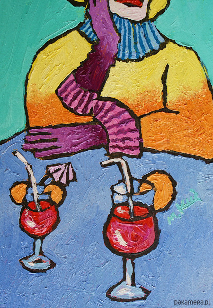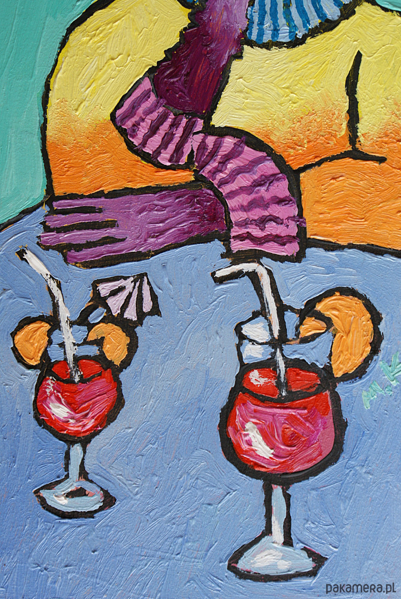 Na obrazie widać kobietę siedzącą przy stoliku, która wygląda jakby była zatopiona w myślach. Jej blond włosy są kontrastowo zestawione z turkusowym tłem, a intensywne kolory stroju przyciągają wzrok. Czerwone usta i okulary nadają jej tajemniczości, jakby coś ukrywały. Na stole stoją dwa drinki z kolorowymi parasolkami. Całość kompozycji sprawia wrażenie, jakby czas się zatrzymał w tym jednym momencie. Technika użyta przez artystę jest odważna, z szerokimi pociągnięciami pędzla i fakturą, która dodaje obrazu dynamiki. Można odczuć tu nonszalancję i pewien rodzaj nostalgii. Emanuje z tego spokój, ale i lekka melancholia. Ale fajne kolory! – powiedziałby młodszy widz, zachwycony intensywnością barw. Ten obraz jest jakby wyjęty z marzeń, trochę surrealistyczny, trochę pop-artowy. Słowo vibe doskonale oddaje klimat tego dzieła. Na końcu pozostaje wrażenie, że obraz ten opowiada jakąś niewypowiedzianą historię, którą każdy może interpretować na swój sposób.
