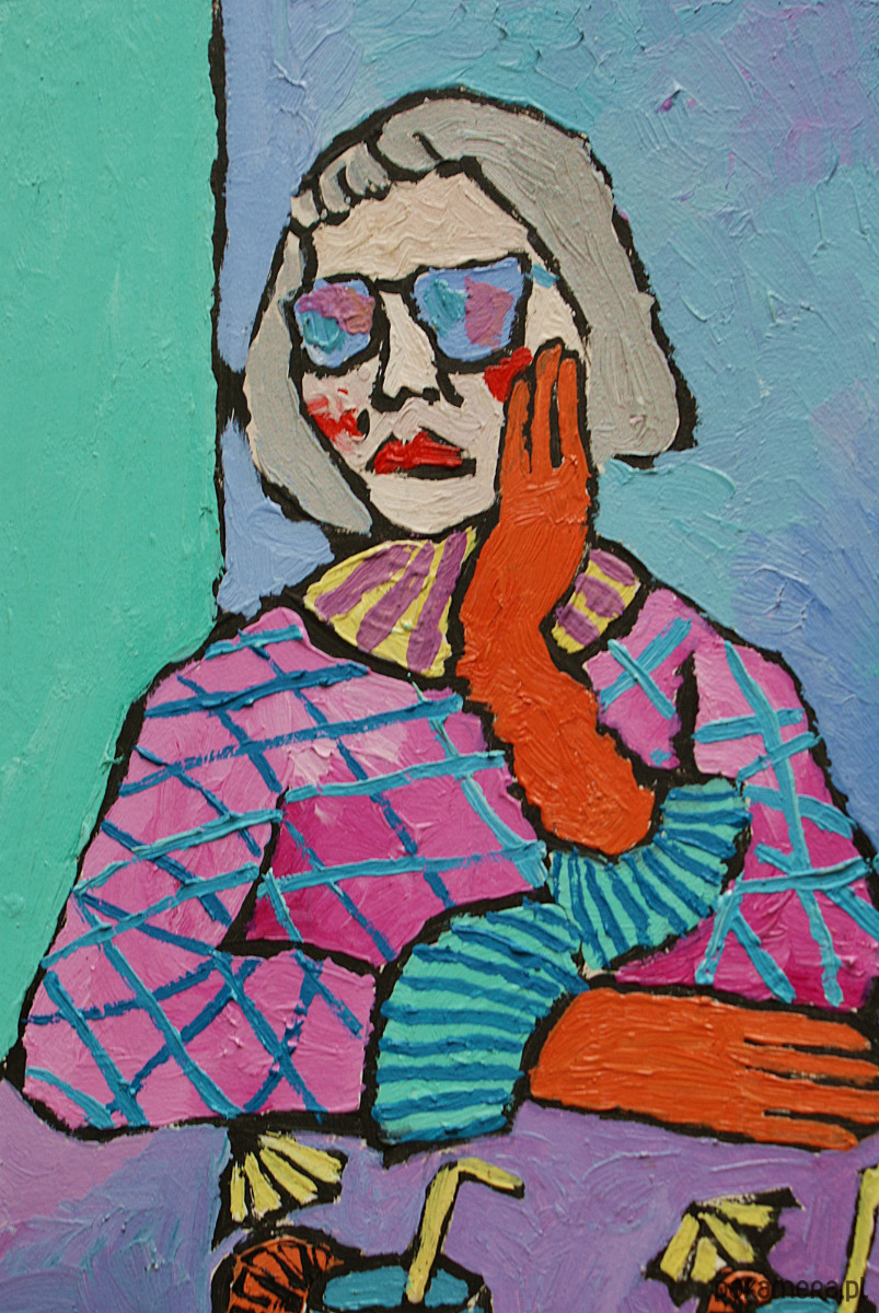 Obraz przyciąga wzrok intensywnymi kolorami i wyrazistymi kształtami. Postać w centrum przy stole emanuje pewnym nostalgicznym spokojem. Ubrana jest w kolorowy strój z wzorami przypominającymi plątaninę linii, które biegną w różnych kierunkach, dodając dynamiki i życia do kompozycji. Tło w odcieniach niebieskiego i fioletu sprawia wrażenie, jakby czas zatrzymał się w tym jednym, magicznym momencie. Atmosfera jest jednocześnie wesoła i trochę melancholijna, jak gdyby zachęcała do zadumy i refleksji. Styl artystyczny przypomina trochę prace fowistów, z ich odważnym podejściem do koloru i uproszczonych form.