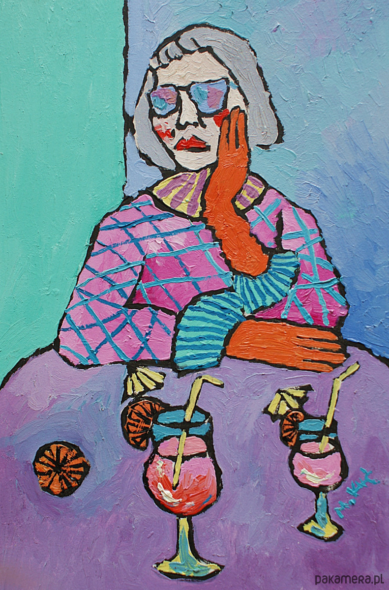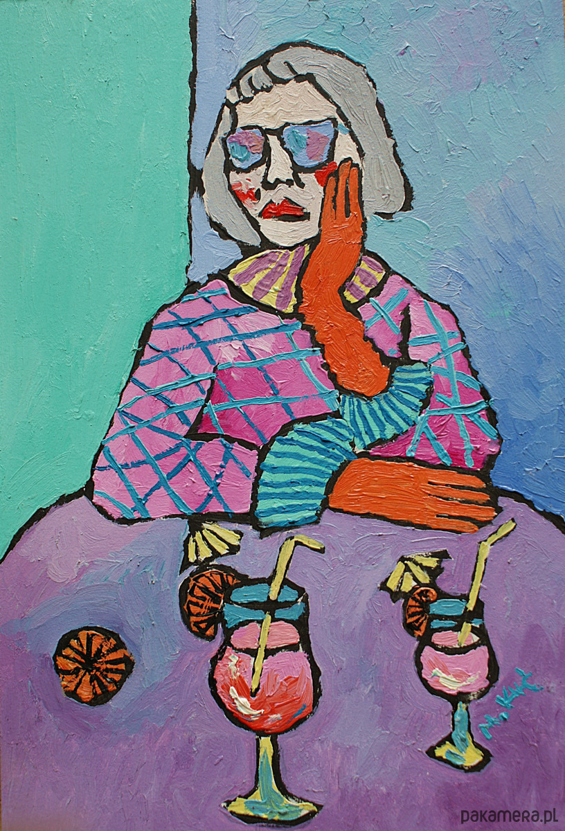 Artysta wydaje się bawić kolorem - intensywny róż, pomarańcz i błękit kontrastują ze sobą, a kompozycja jest jednocześnie uporządkowana i spontaniczna. Jakby ktoś miał na chwilę dziecku pędzel oddać. Na stole widoczne są dwa kieliszki z napojami i kawałki owoców, które dodają wakacyjnego nastroju, jakby zapraszały do chwili odprężenia. Obraz może wywoływać u odbiorcy wspomnienia z beztroskich chwil spędzonych
