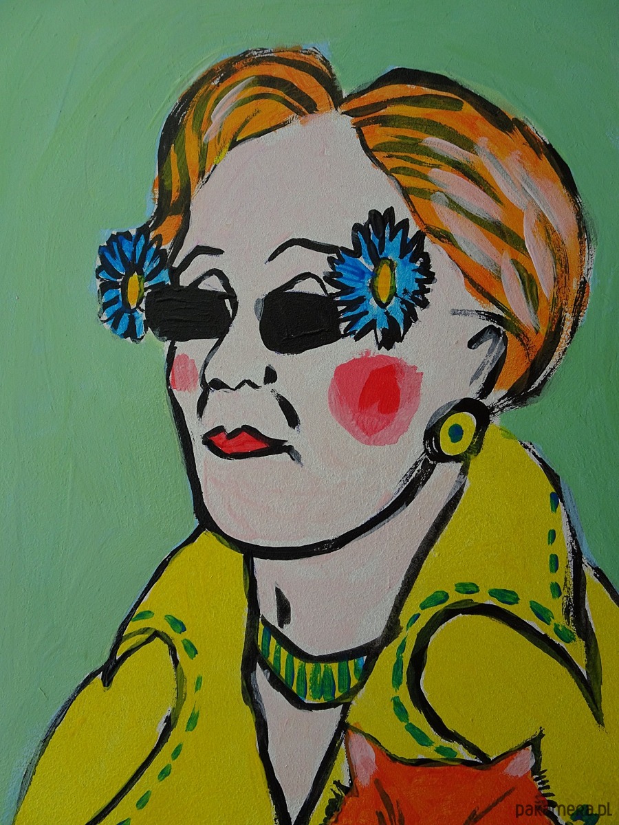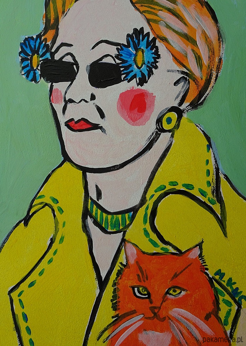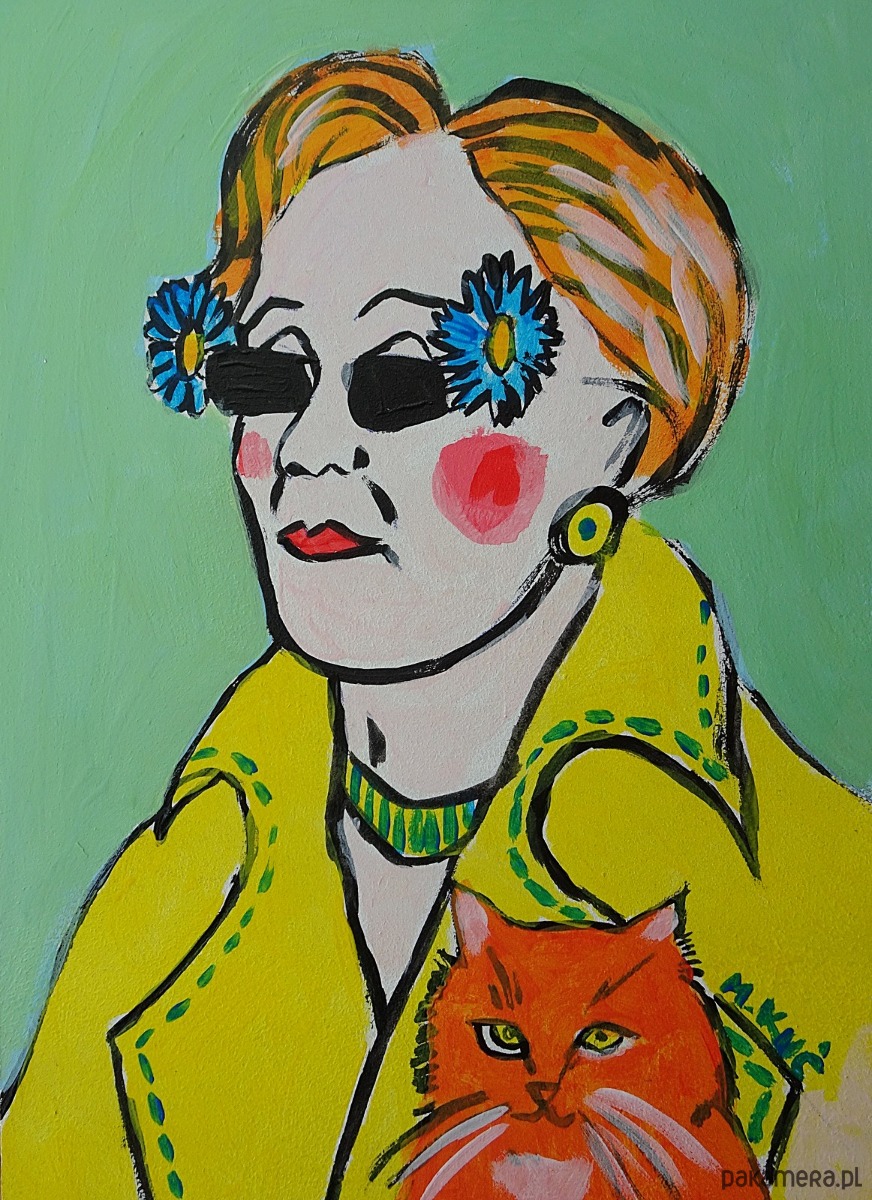 Na obrazie widzimy postać kobiety, która emanuje niezwykłą pewnością siebie i dystynkcją. Jej pomarańczowe włosy kontrastują z zielonym tłem, tworząc żywe zestawienie kolorów. Artysta zastosował wyraziste kontury i jaskrawe barwy, co nadaje pracy poczucie ekspresyjności. Kobieta ma okulary przeciwsłoneczne, a na ich miejscach kwitną niebieskie kwiaty, co dodaje surrealizmu. Na jej twarzy widnieją rumieńce, które sprawiają, że wygląda jakby była gotowa na przygody. Żółty płaszcz, ozdobiony zielonymi akcentami, uzupełnia tę pełną koloru kompozycję. Obok niej zasiada rudy kot, patrząc z lekkim wyrazem tajemnicy.