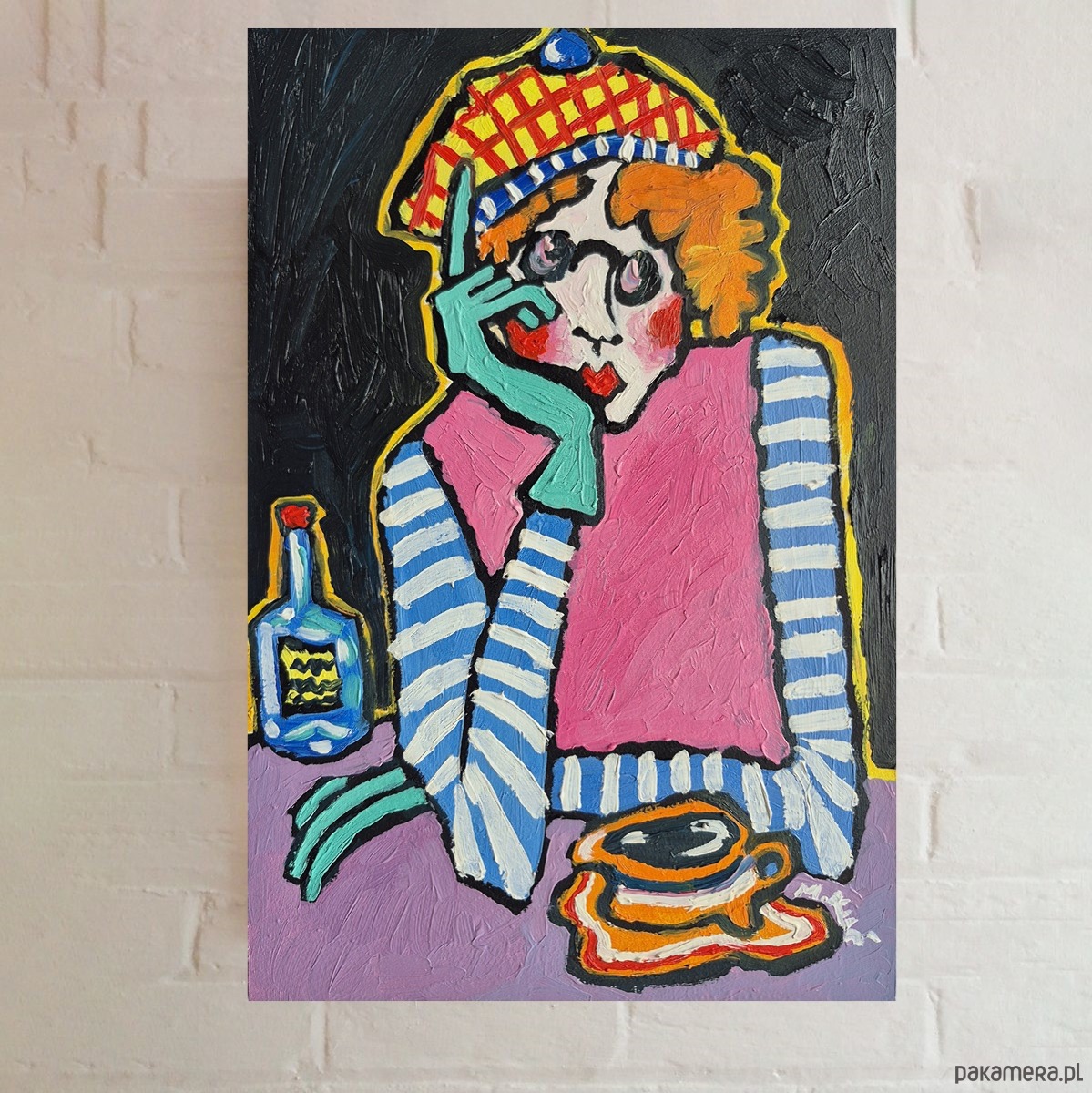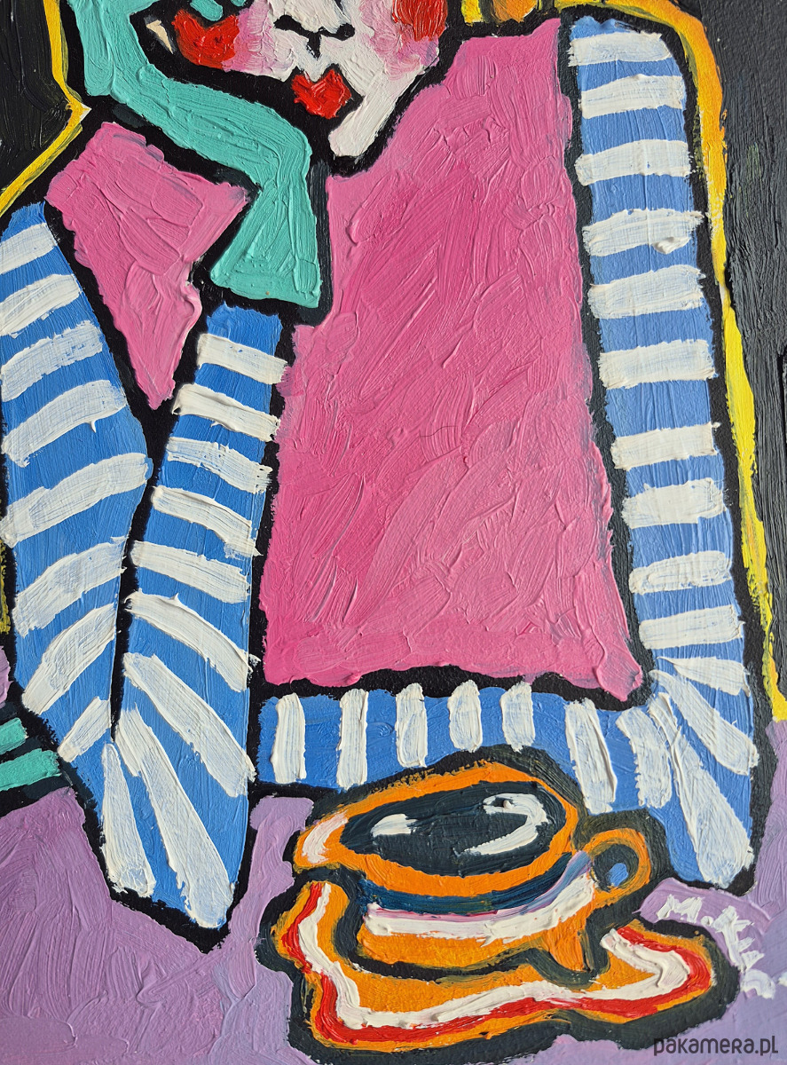 Całość kompozycji przywodzi na myśl estetykę ekspresjonizmu i sztuki prymitywistycznej, gdzie deformacja nie jest błędem, lecz świadomym środkiem wyrazu. Obraz nie opowiada historii wprost — raczej zaprasza widza do wejścia w stan emocjonalny, w którym zwykła chwila staje się nośnikiem ukrytych napięć, samotności i cichej refleksji nad codziennością.