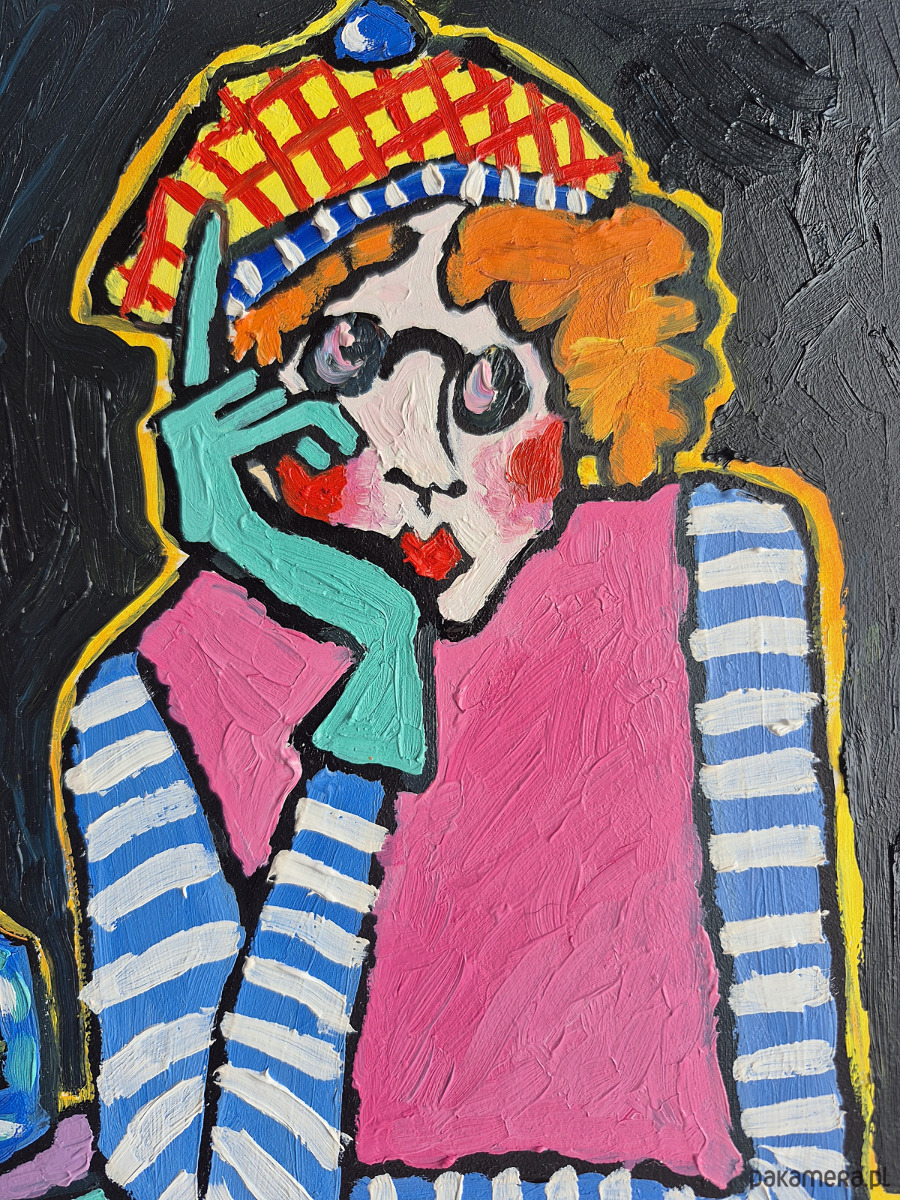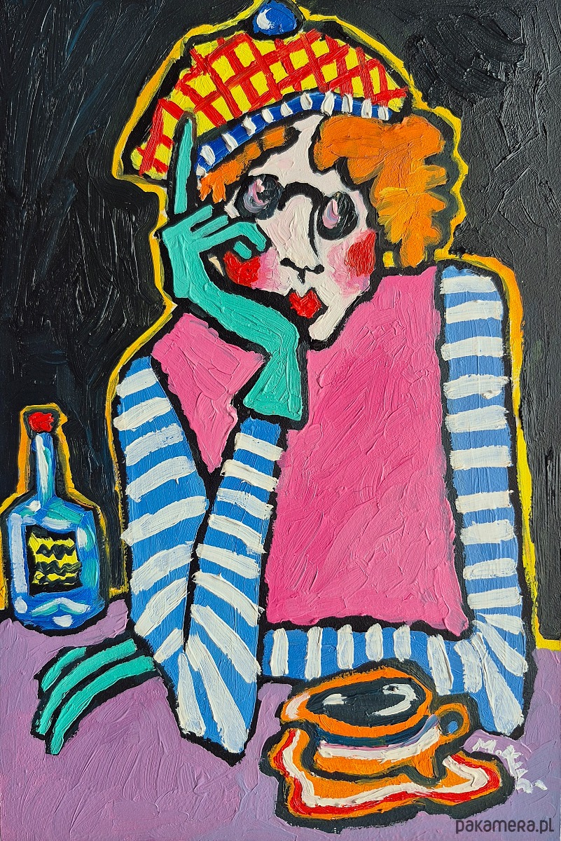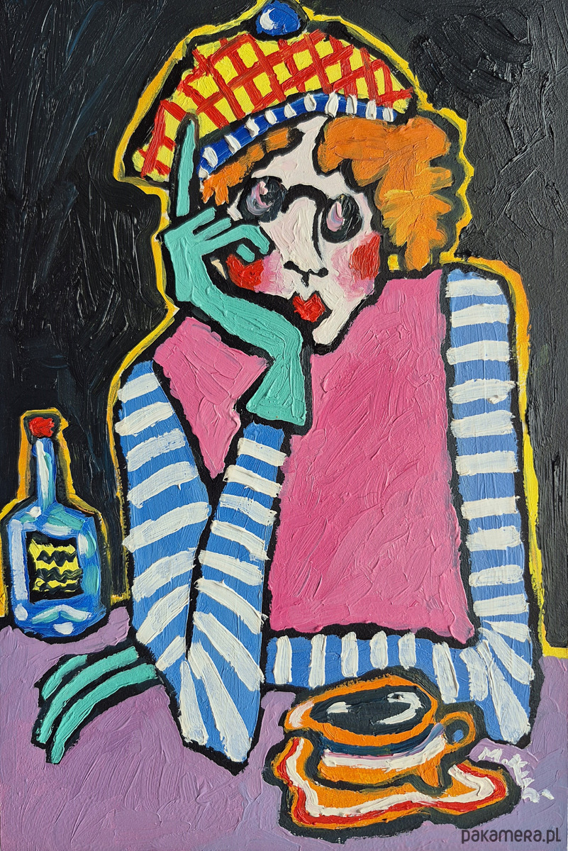 Obraz pulsuje intensywnością barw i emocji, balansując na granicy naiwności i świadomej deformacji. Centralna postać — kobieta o przerysowanych rysach, ukryta za grubymi konturami i kontrastowymi plamami koloru — zdaje się zawieszona w stanie cichej zadumy. Jej twarz, niemal maskowata, z wyraźnie zaznaczonymi rumieńcami i zamyślonym spojrzeniem, niesie w sobie nutę melancholii, ale i subtelnej ironii.