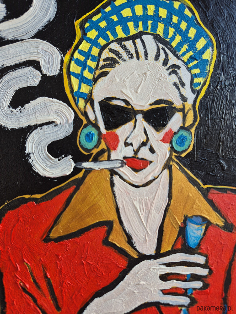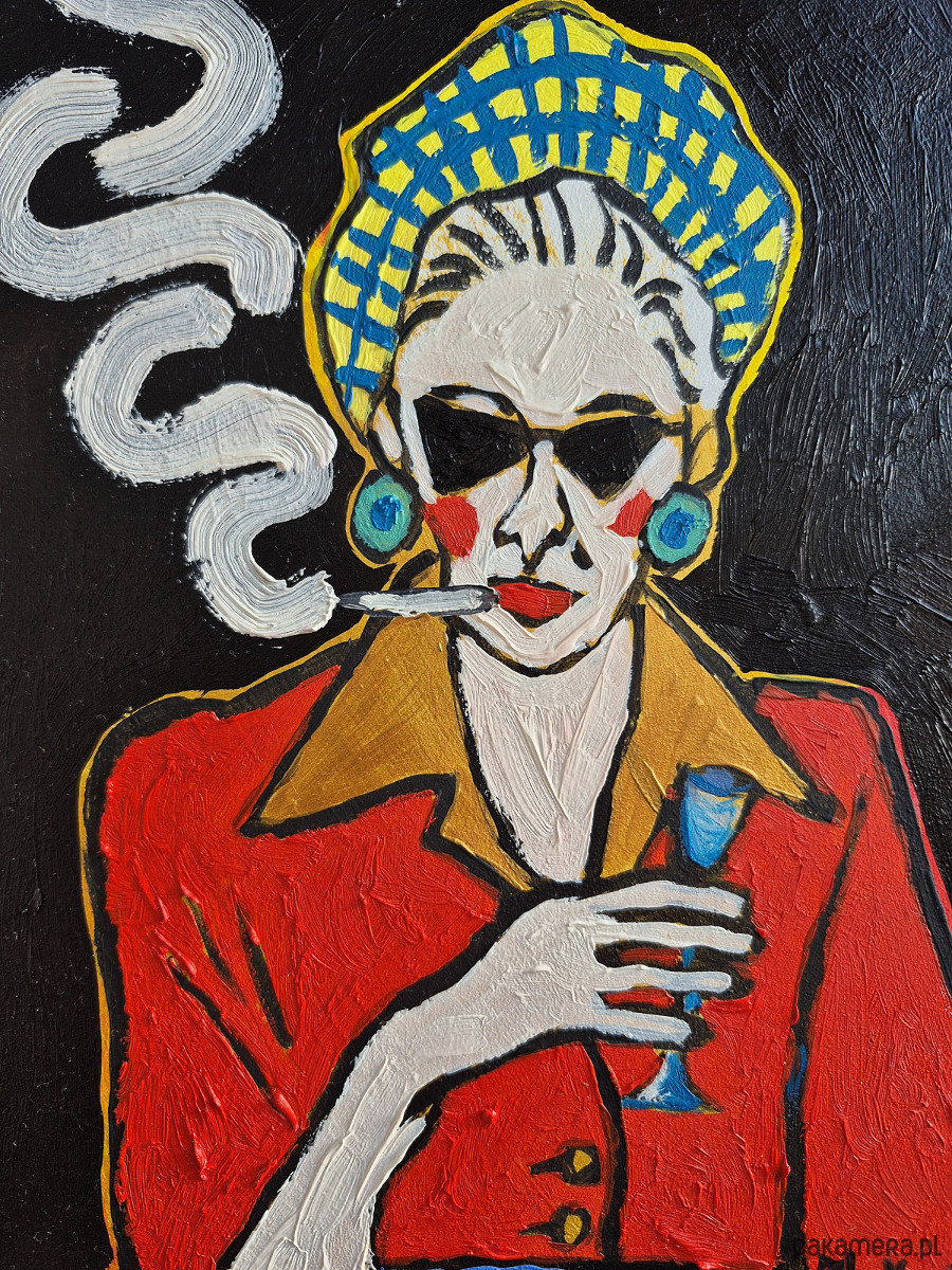Na czarnym tle, które pochłania wszystko jak noc bez gwiazd, siedzi kobieta – figura wycięta z kontrastów, z ostrych linii i zdecydowanych barw. Jej twarz jest maską: blada, niemal marmurowa, przecięta cieniem ciemnych okularów. Nie patrzy – ukrywa spojrzenie. Jakby świat był czymś, co należy filtrować, oswajać szkłem.