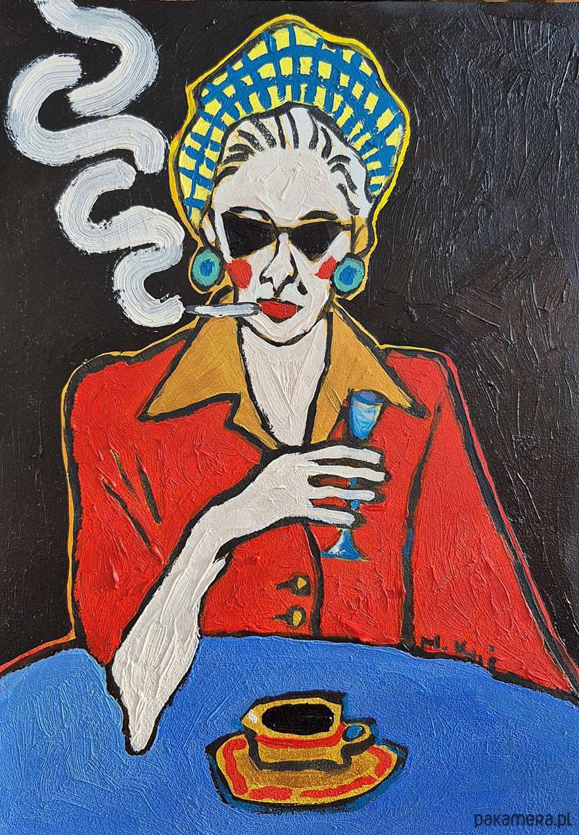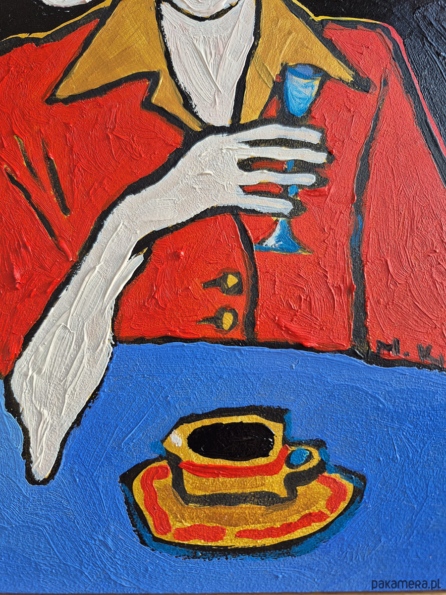 Czerwień jej marynarki pulsuje – to kolor życia, buntu, odwagi, ale też ostrzeżenia. W zestawieniu z chłodnym błękitem stołu i kieliszka tworzy napięcie: ogień i woda, ciało i dystans, namiętność i kontrola. W dłoni trzyma kieliszek – delikatny, niemal kruchy – jakby balansowała między celebracją a samotnością. Na stole filiżanka czarnej kawy: gęsta, nieprzenikniona, jak myśli, których nie wypowiada.