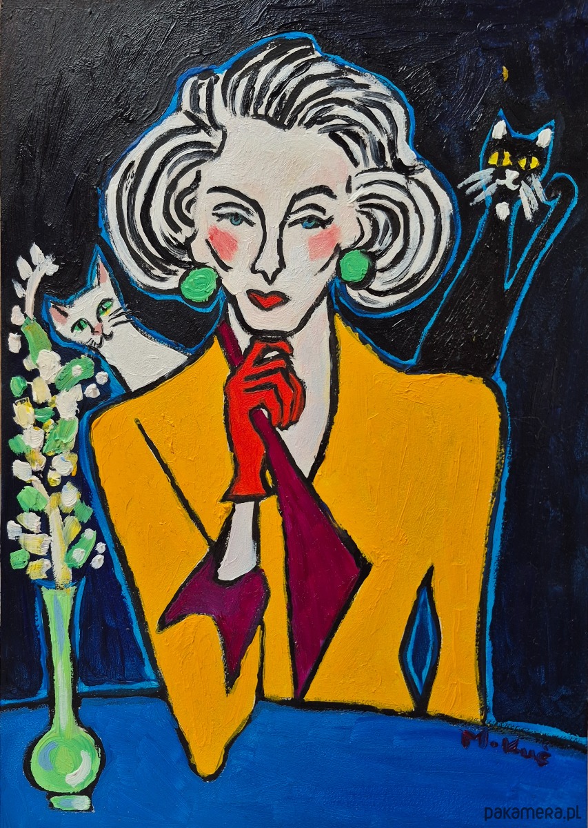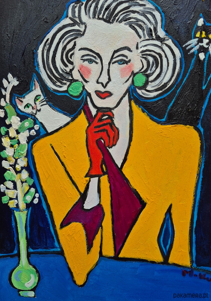 Na obrazie dominuje głęboka czerń tła, jakby noc była tu gęsta i lekko chropowata od farby. Pośrodku siedzi kobieta o twarzy zbudowanej z prostych linii, bieli i różowych rumieńców, z włosami w szerokich, falujących pasmach. Żółta marynarka świeci jak latarnia, a czerwone rękawiczki i usta robią mocny kontrast. Zielone kolczyki są okrągłe i trochę zuchwałe. Z lewej wąski wazon z białymi kwiatami, obok biały kot, z prawej czarny z żółtymi oczami. Jest trochę jak teatr. Artysta używa grubego konturu i płaskich plam koloru, w stylu lekko ekspresyjnym, z widoczną fakturą pociągnięć. Czuję spokój i napięcie naraz, taki mood do myślenia. Ona wygląda, jakby znała sekret i nie chciała go powiedzieć. Koty są śmieszne i trochę straszne. To pani i dwa kotki.
