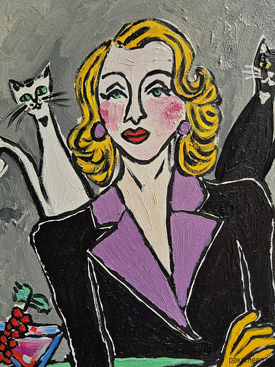Po obu stronach kobiety siedzą dwa koty — biały i czarny — niczym symboliczni strażnicy równowagi. Ich zielone oczy błyszczą tajemniczo, wprowadzając element niepokoju i magii. W dolnym rogu obrazu stoi kieliszek koktajlowy z czerwonym napojem i kiścią winogron, co dodaje scenie nuty luksusu i lekkiej dekadencji.