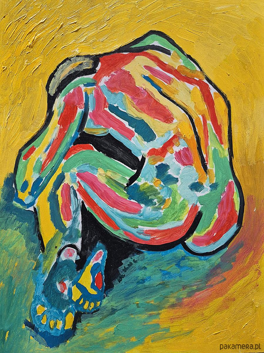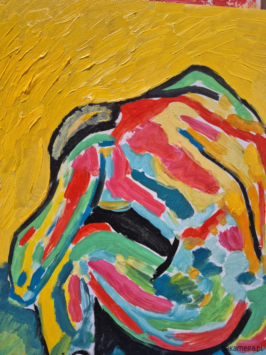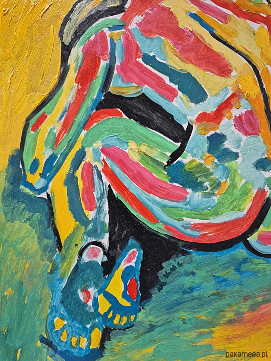 Najbardziej poruszające jest jednak ciało – nie w naturalnym kolorze skóry, lecz w plamach i smugach czerwieni, turkusu, zieleni, błękitu. Jakby emocje wyszły na powierzchnię i zastąpiły anatomię. Czerwienie pulsują jak gniew albo wstyd. Zieleń i turkus chłodzą – są jak próba uspokojenia oddechu. Błękity przy stopach przypominają cień, ciężar, przyziemność. Całość wygląda jak mapa wewnętrznego chaosu, malarska topografia przeżyć.