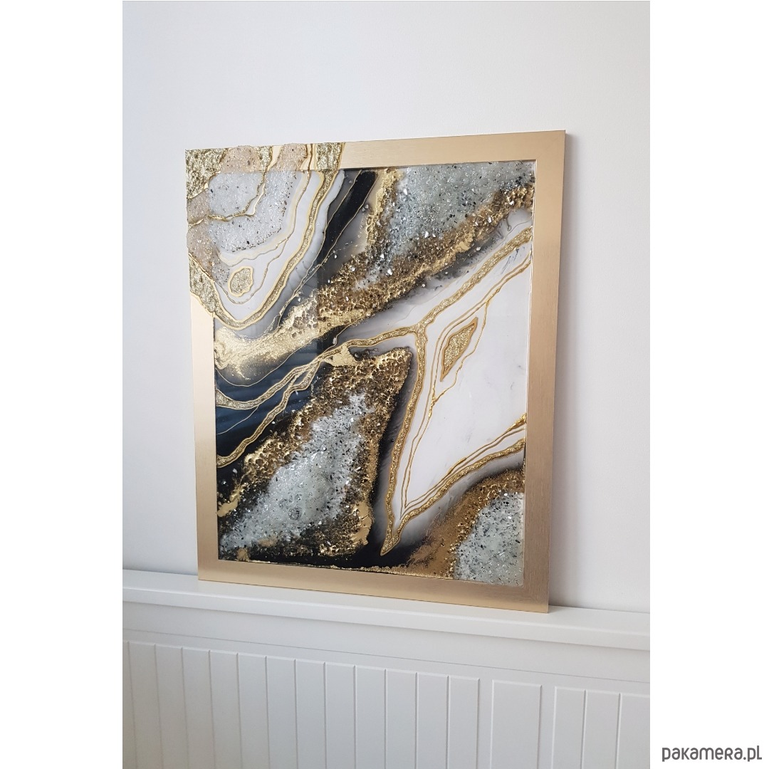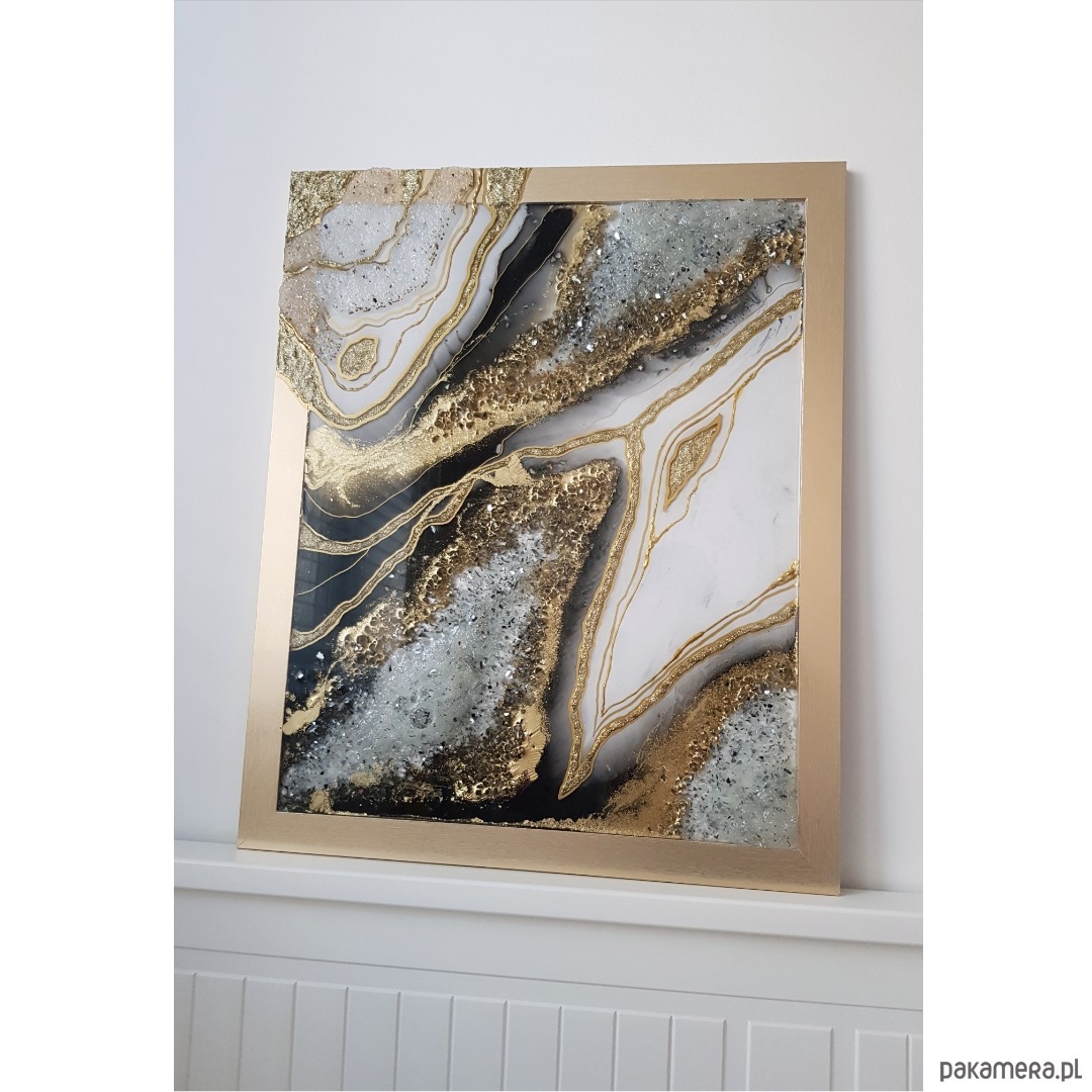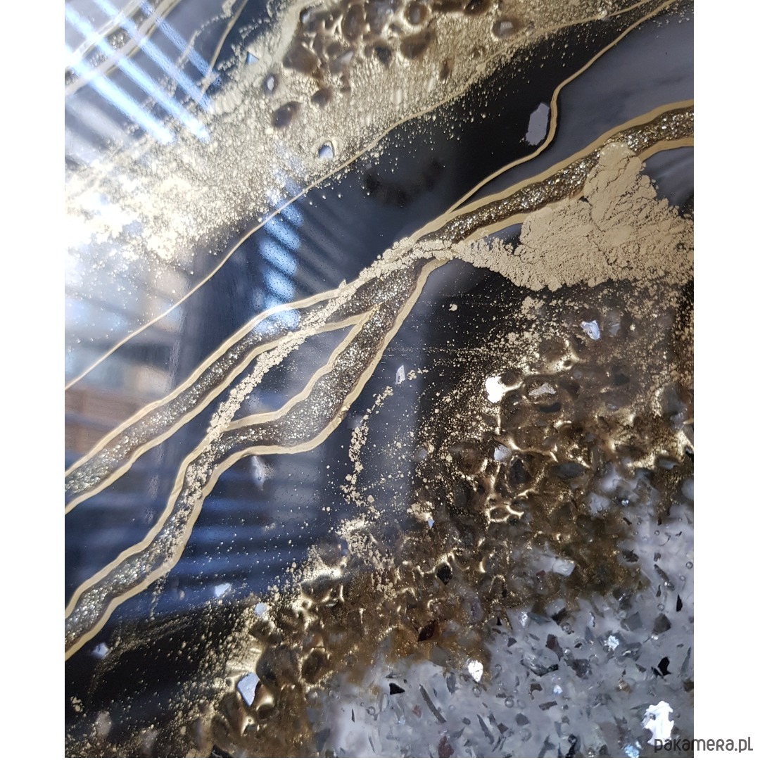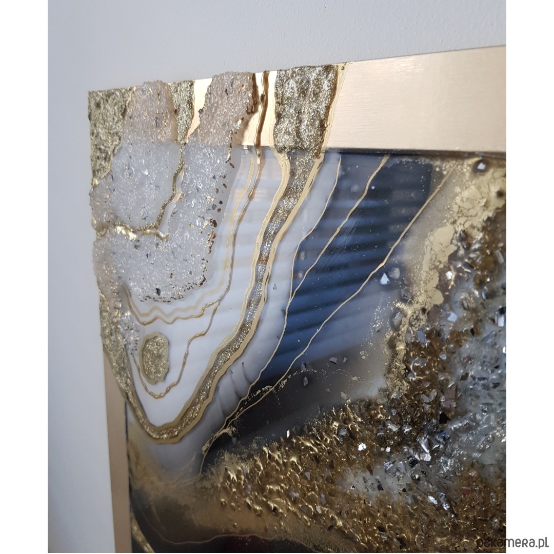 Obraz wykonany z żywicy epoksydowej z dodatkiem kamieni i kryształków. Nowoczesna sztuka geode art, polegająca na tworzeniu obrazów przypominających naturalne kamienie szlachetne